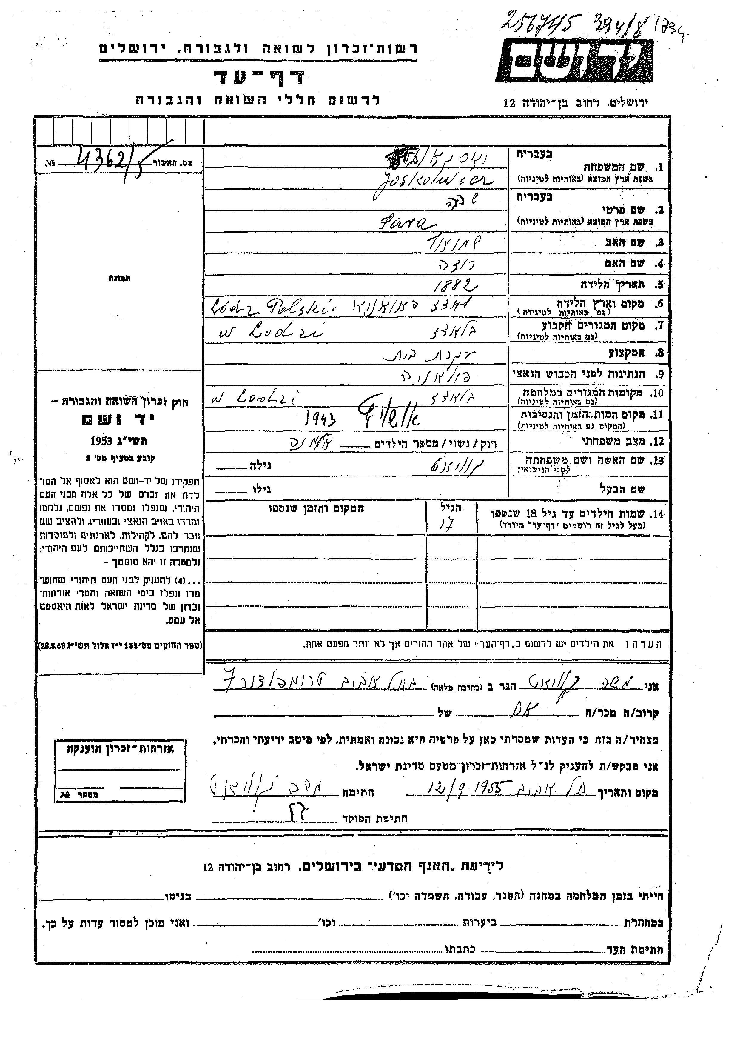 Йоскович Имя неизвестно Лодзь, Польша Лист свидетельских показаний