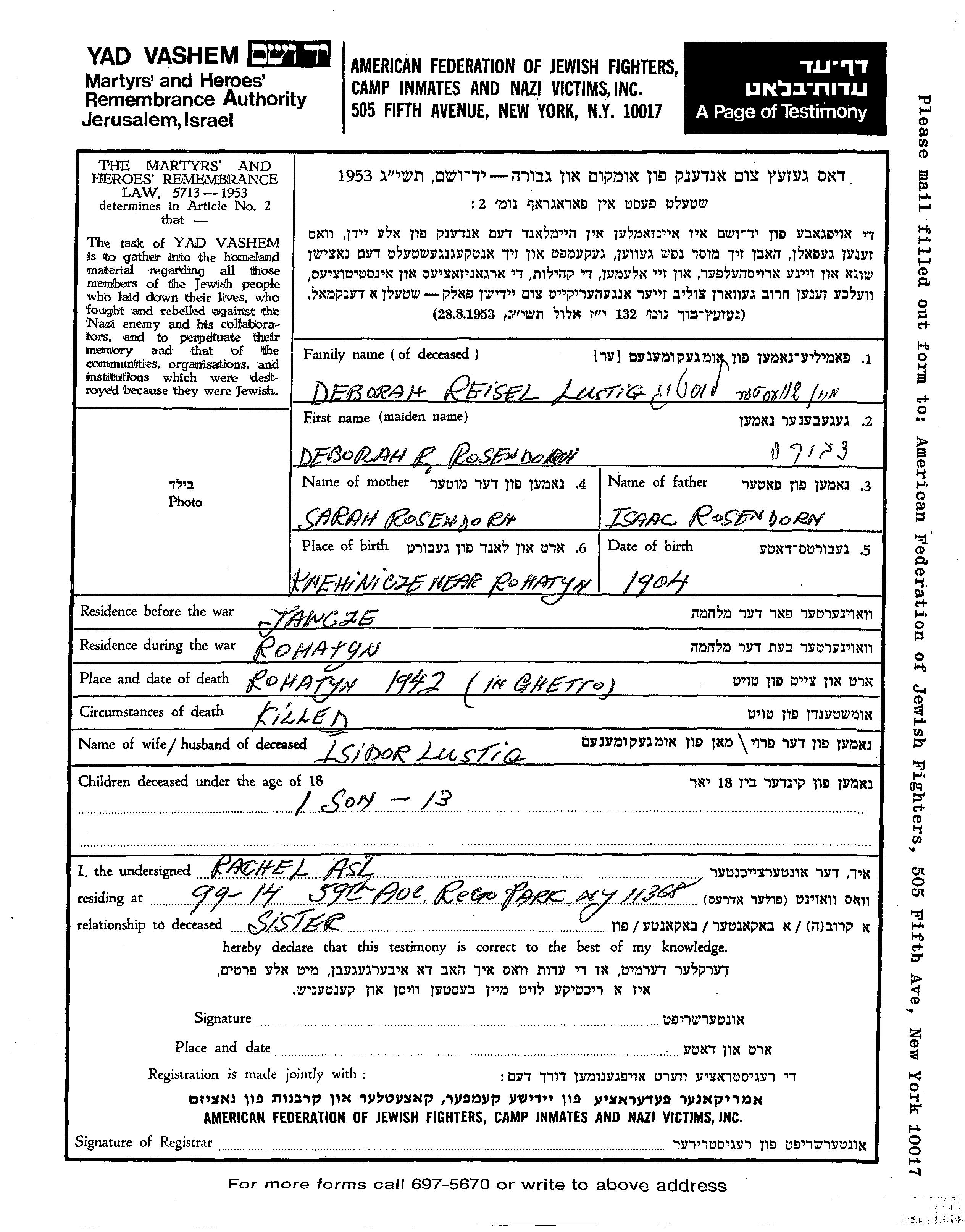 Люстиг Имя неизвестно Явче, Польша Лист свидетельских показаний