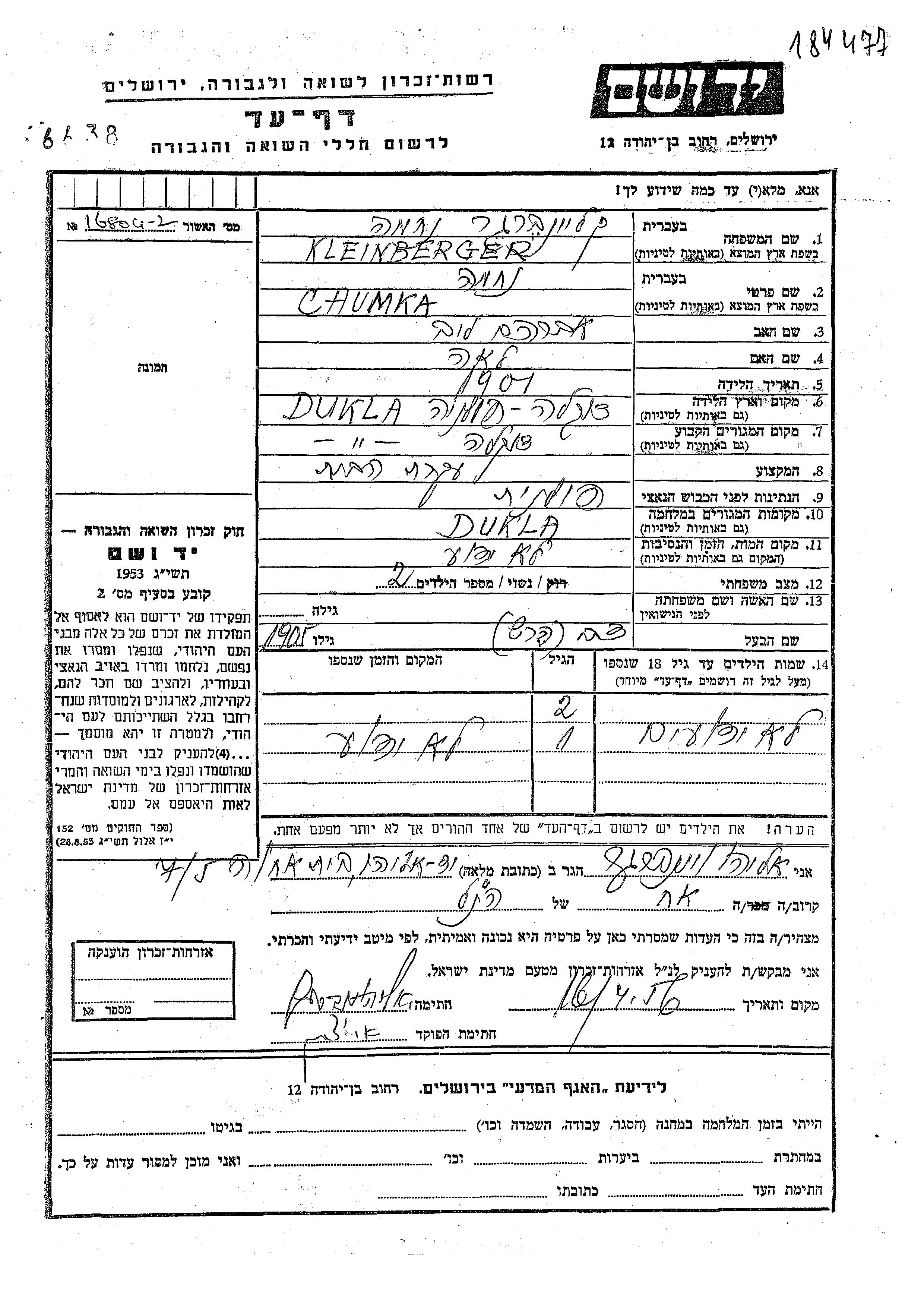 Имя неизвестно Клейнбергер родился/родилась Цви Герш Хумка. Ребенок. Место жительства до войны: Дукля, Польша. Место во время войны: Дукля, Польша.