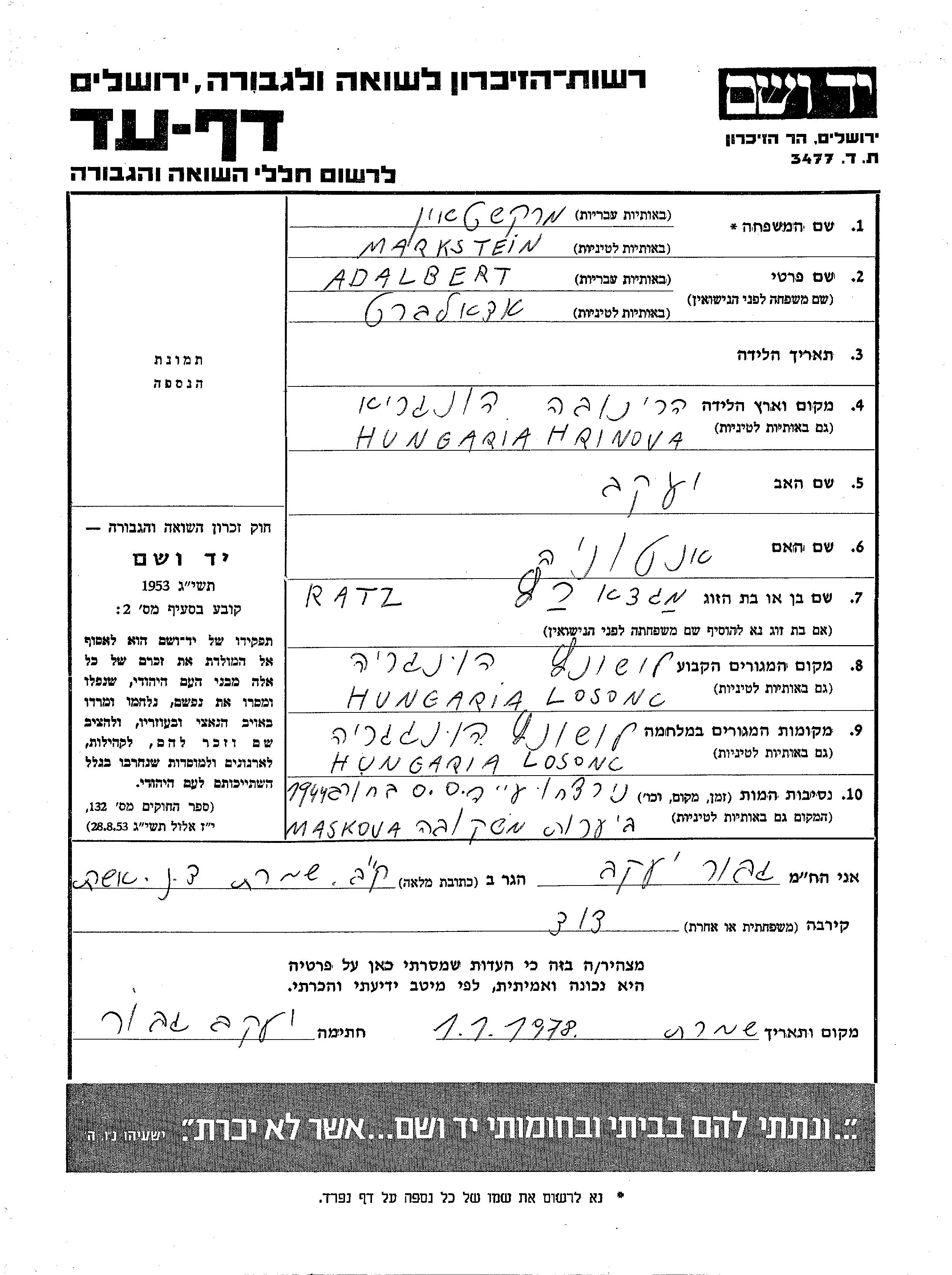 Адальберт Маркштейн, место рождения: Гринова, Чехословакия. Отец: Яков, mать:Антония. Женат / замужем. Место жительства до войны: Лошонц, Чехословакия. Место во время войны: Лошонц, Чехословакия.