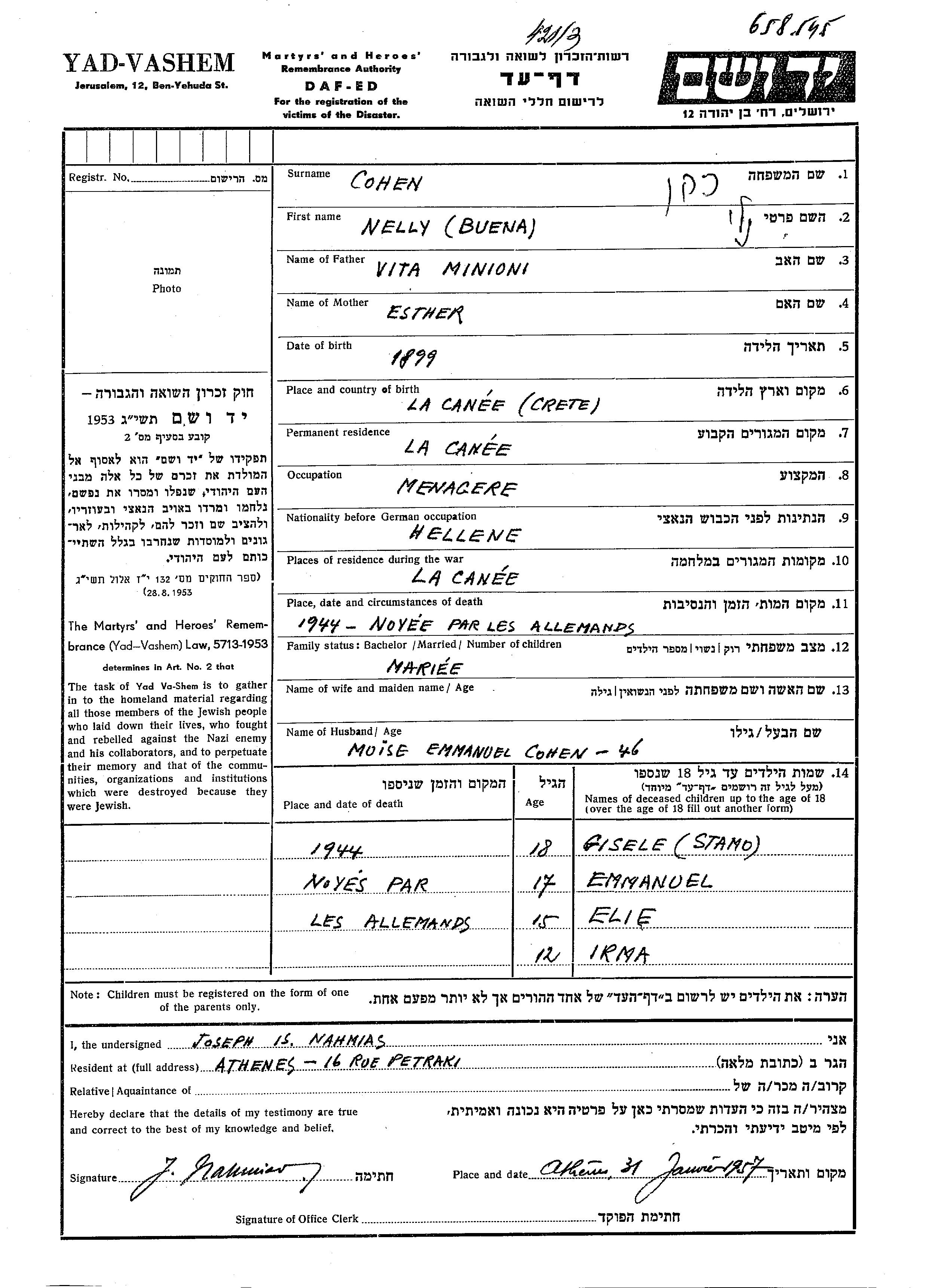 Нелли Буэна Коэн, девичья фамилия Миньони, место рождения: Ханья, Греция. Отец: Вита, mать:Эстер. Директор. Женат / замужем. Место жительства до войны: Ханья, Греция. Место во время войны: Ханья, Греция.