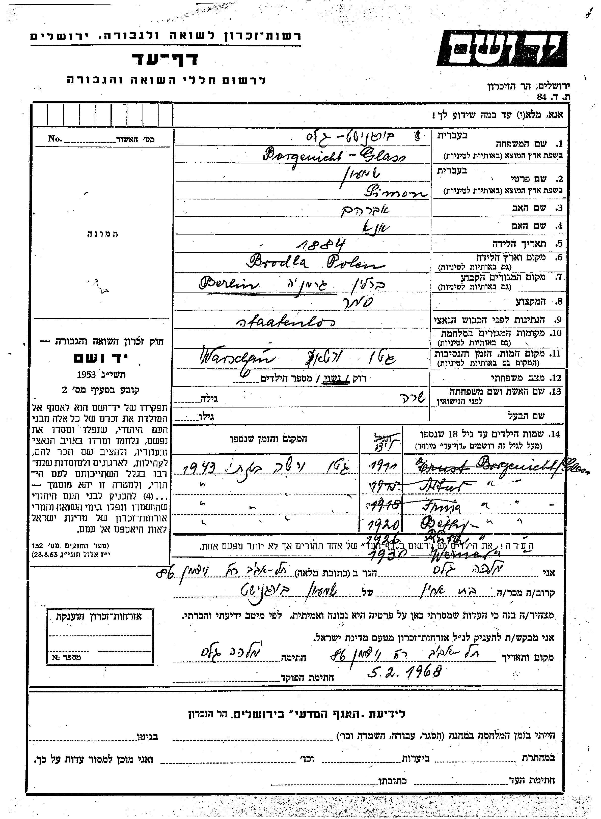 Симон Боргенихт Гласс, место рождения: Бродла, Польша. Отец: Авраам, mать:Ана. Торговец / торговка. Женат / замужем. Место жительства до войны: Берлин, Германия.