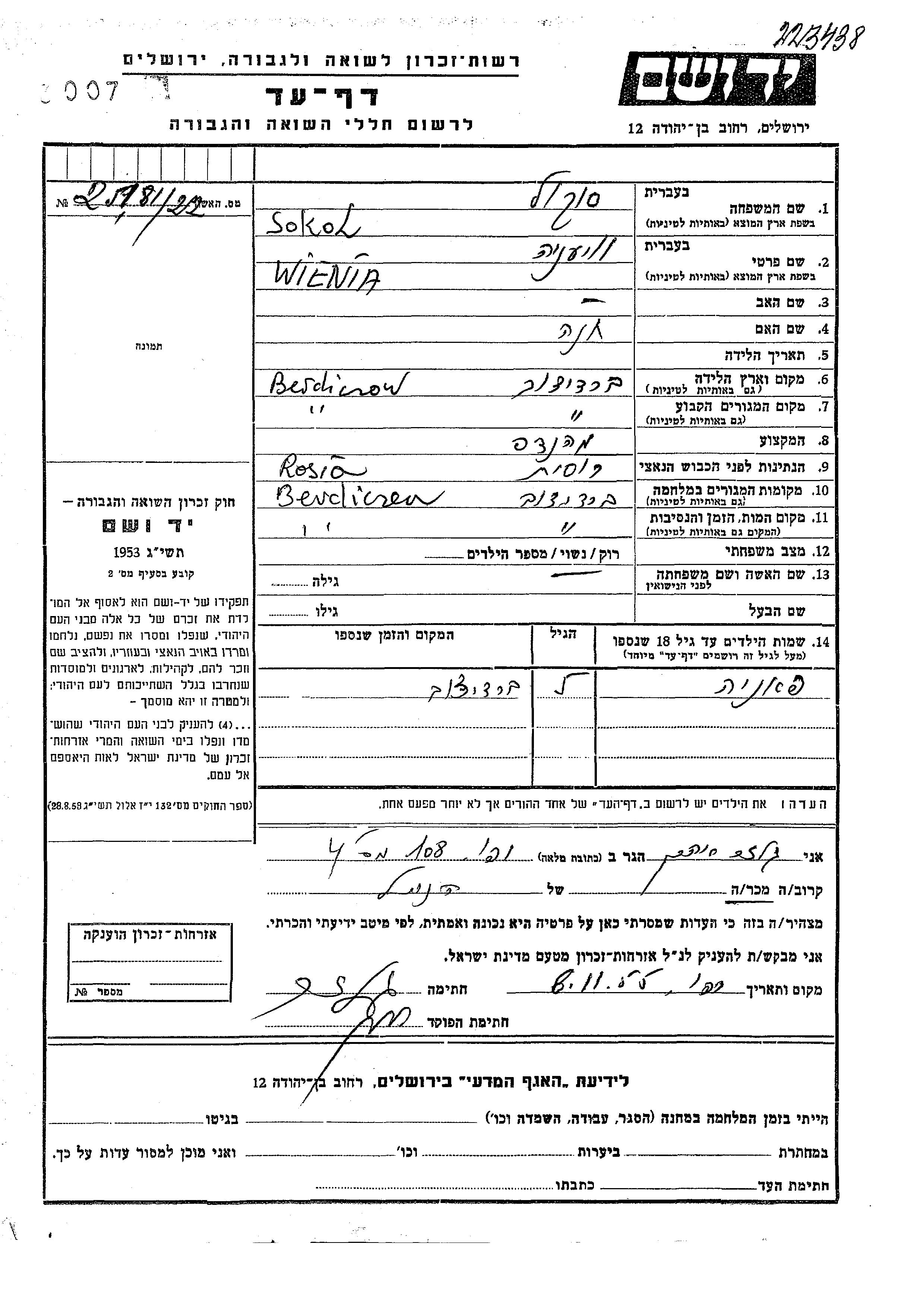 Беньямин Сокол, место рождения: Бердичев, Украина (СССР).Mать:Хана. Инженер. Женат / замужем. Место жительства до войны: Бердичев, Украина (СССР). Место во время войны: Бердичев, Украина (СССР).