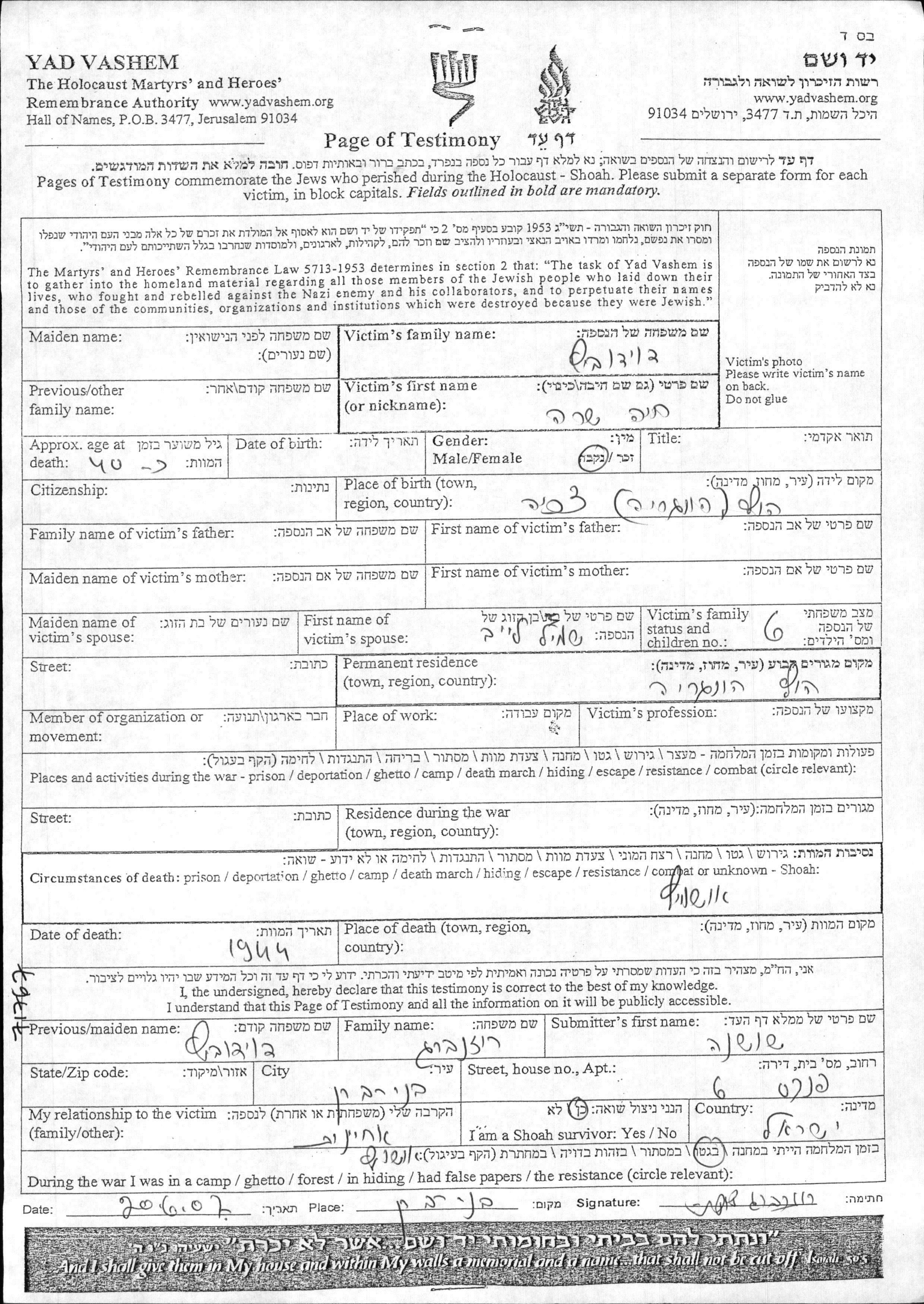 Яд Вашем - Листы свидетельских показаний Мемориального фонда