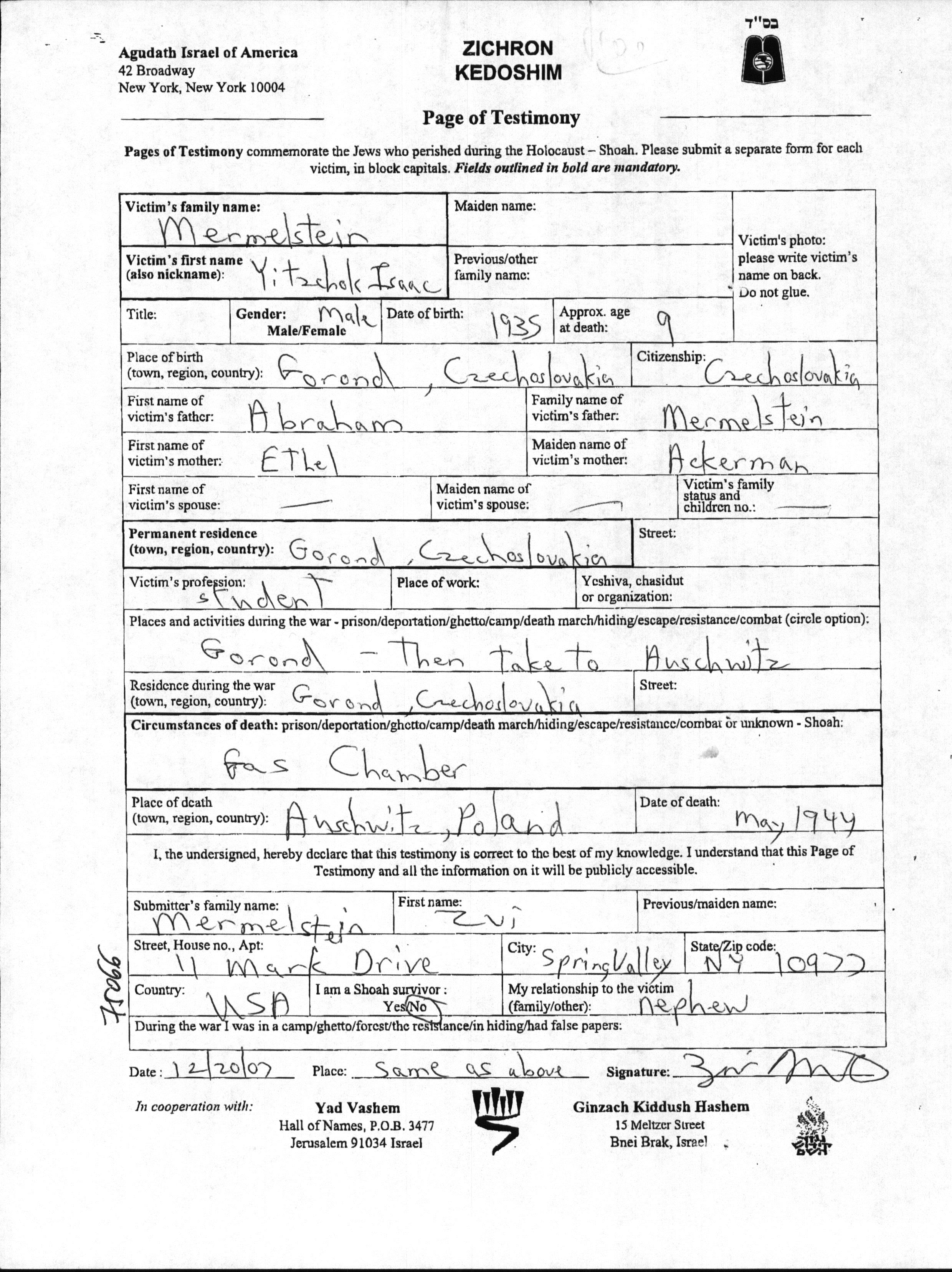 Ицхок Мермельштейн, место рождения: Горонд, Чехословакия. Отец: Абраам, mать:Этель, девичья фамилия Акерман. Студент / студентка. Ребенок. Место жительства до войны: Горонд, Чехословакия. Место во время войны: Горонд, Чехословакия.