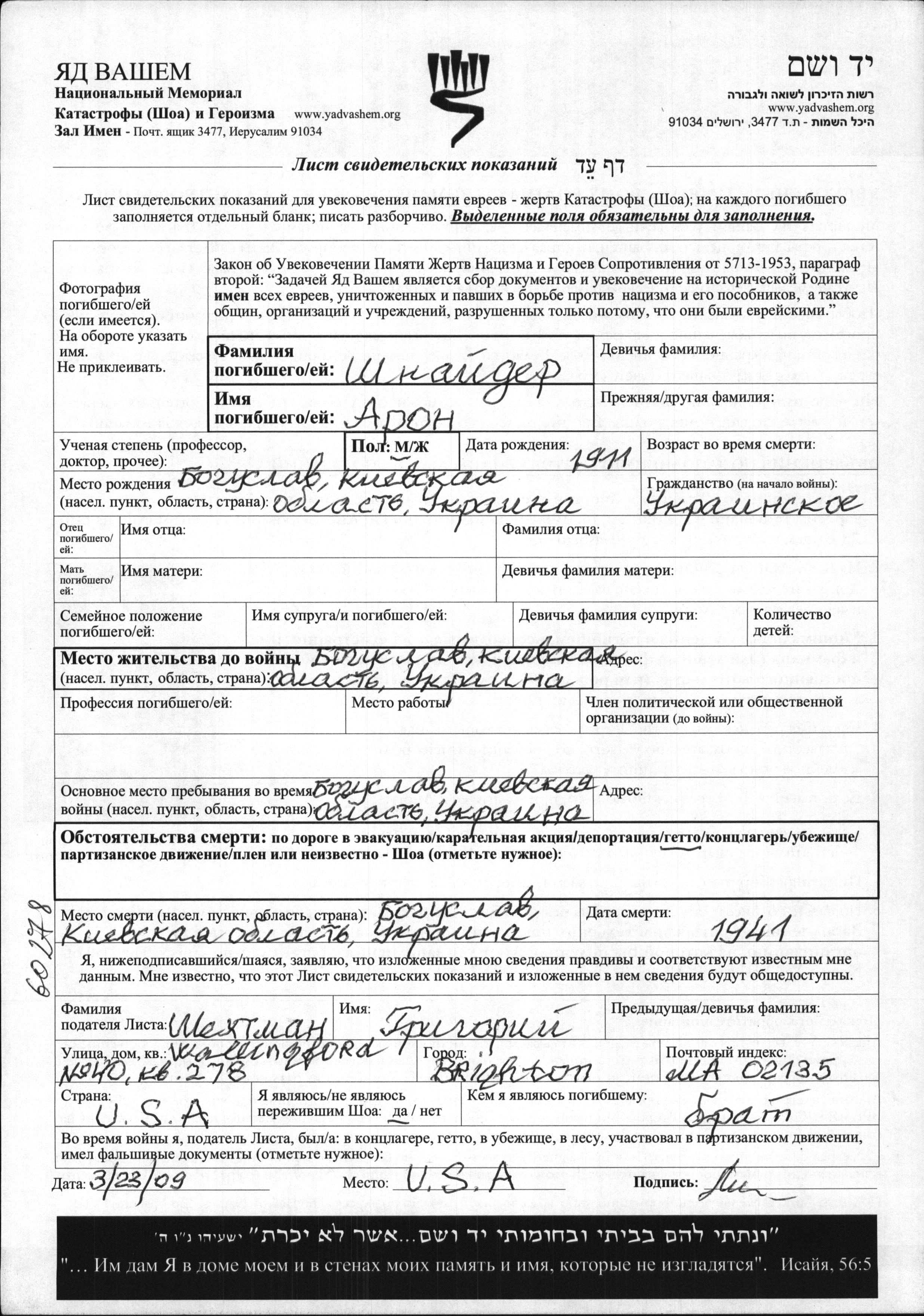Шнайдер Арон 1911 Богуслав, Украина (СССР) Лист свидетельских показаний