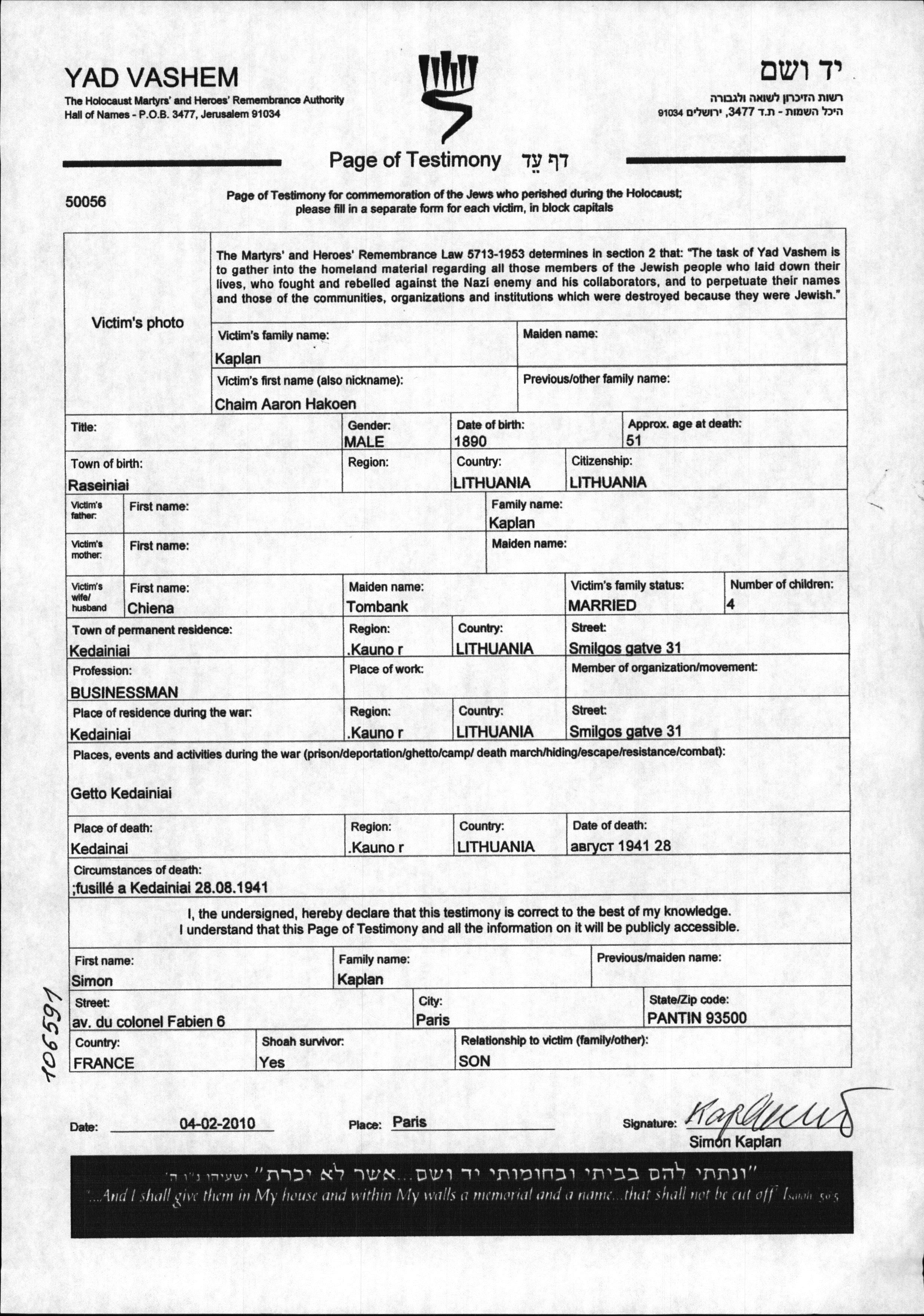 Хаим Аарон Каплан Акоэн, место рождения: Расейняй, Литва. Предприниматель. Женат / замужем. Место жительства до войны: Кейданяй, Литва. Место во время войны: Кейданяй, Литва.