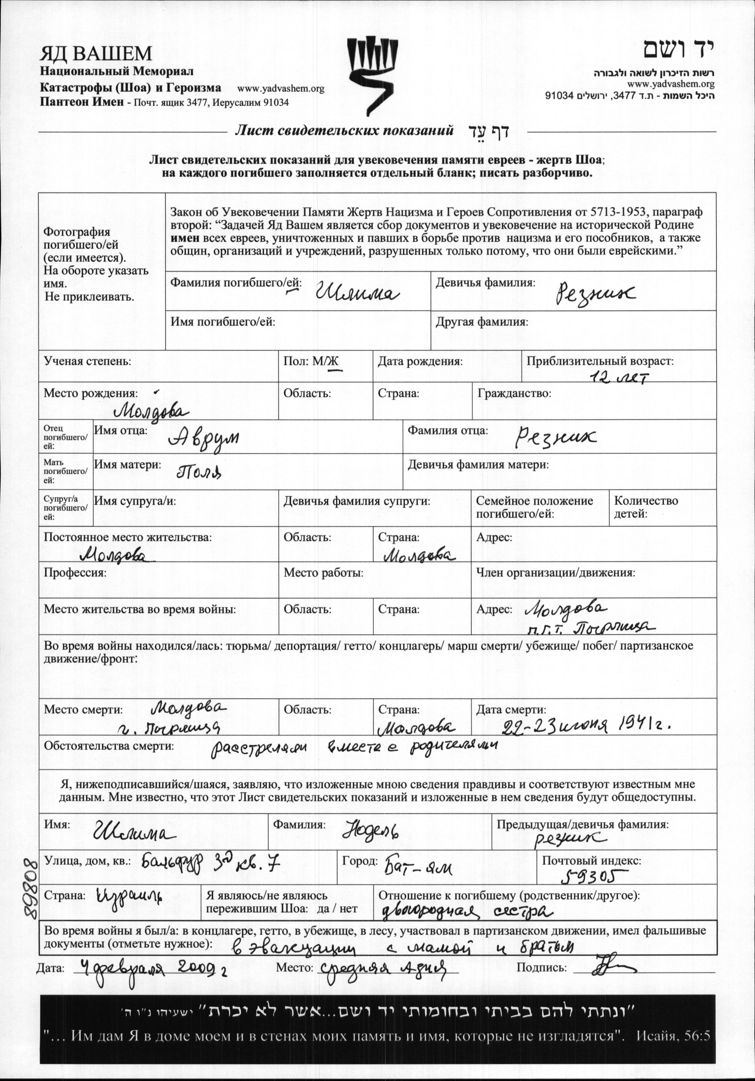 Яд Вашем - Листы свидетельских показаний Мемориального фонда