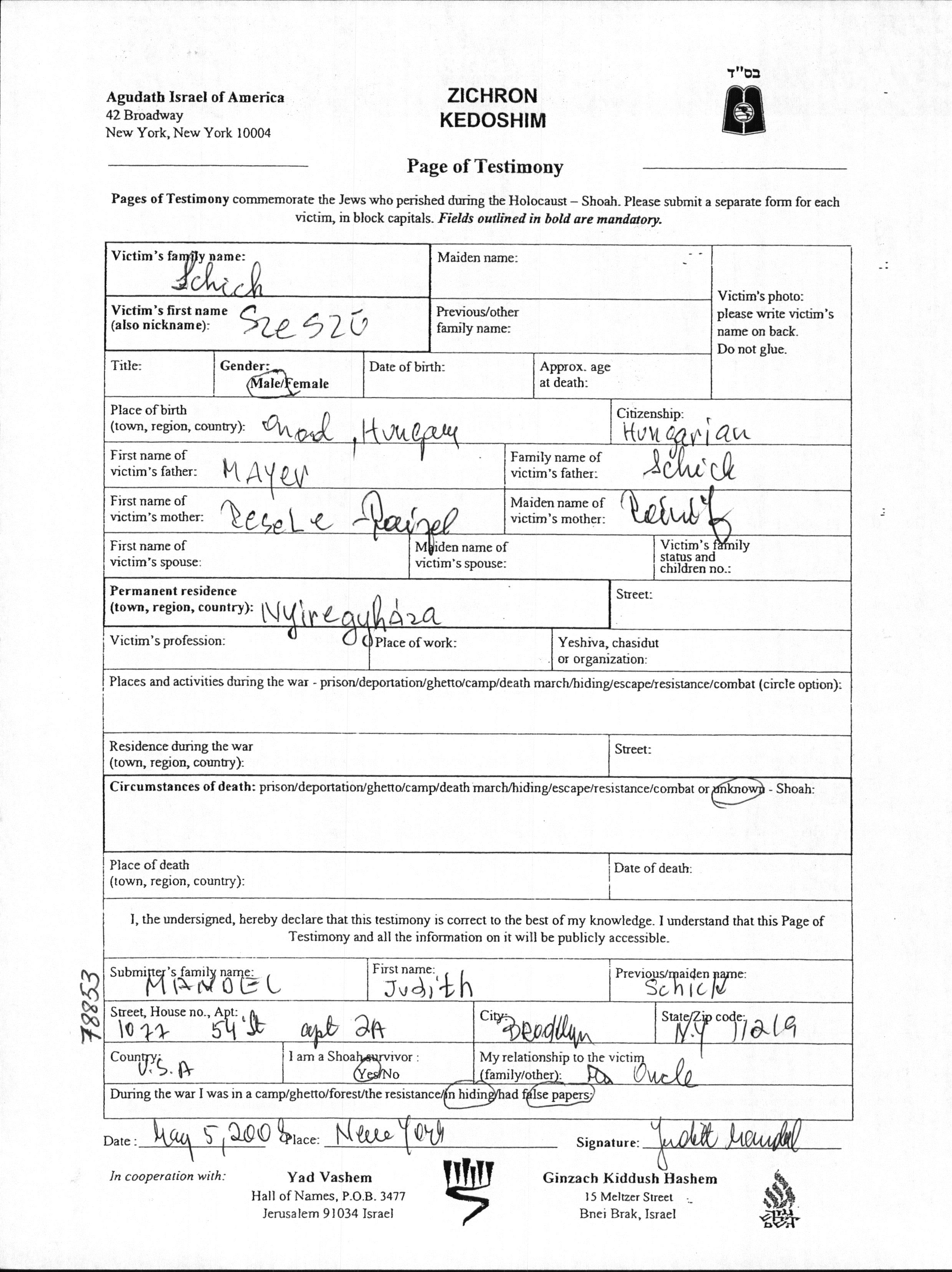 Сесу Шик, место рождения: Онод, Венгрия. Отец: Майер, mать:Резеле. Место жительства до войны: Ньиредьхаза, Венгрия.