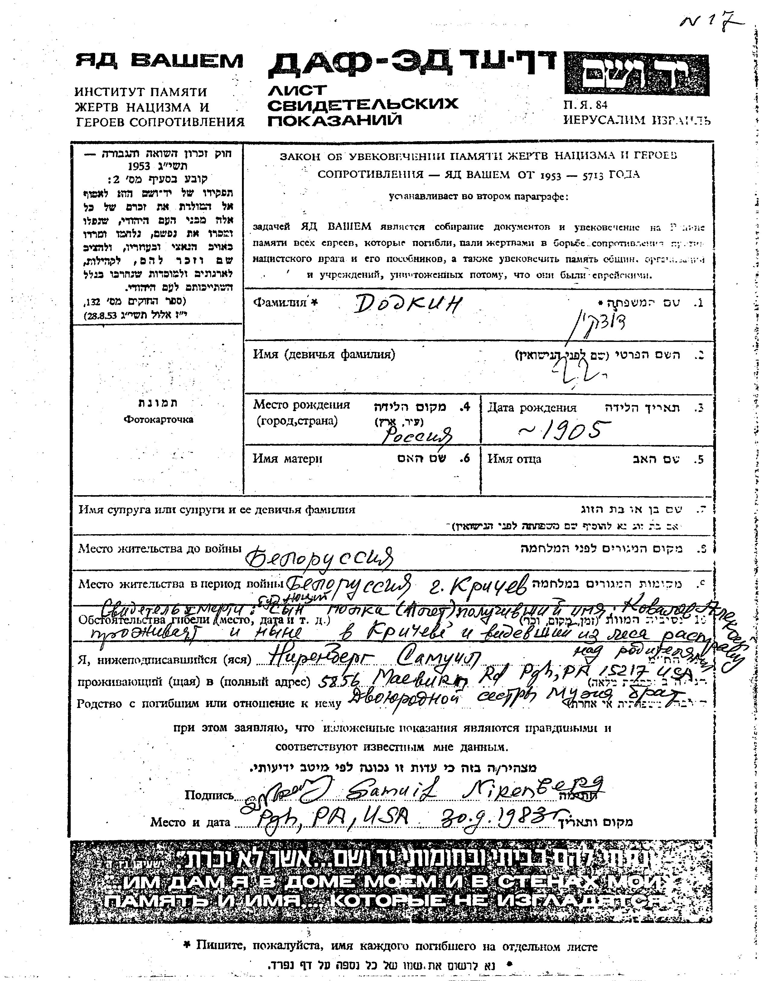 Додкин Имя неизвестно 1905 Белоруссия (СССР) Лист свидетельских показаний