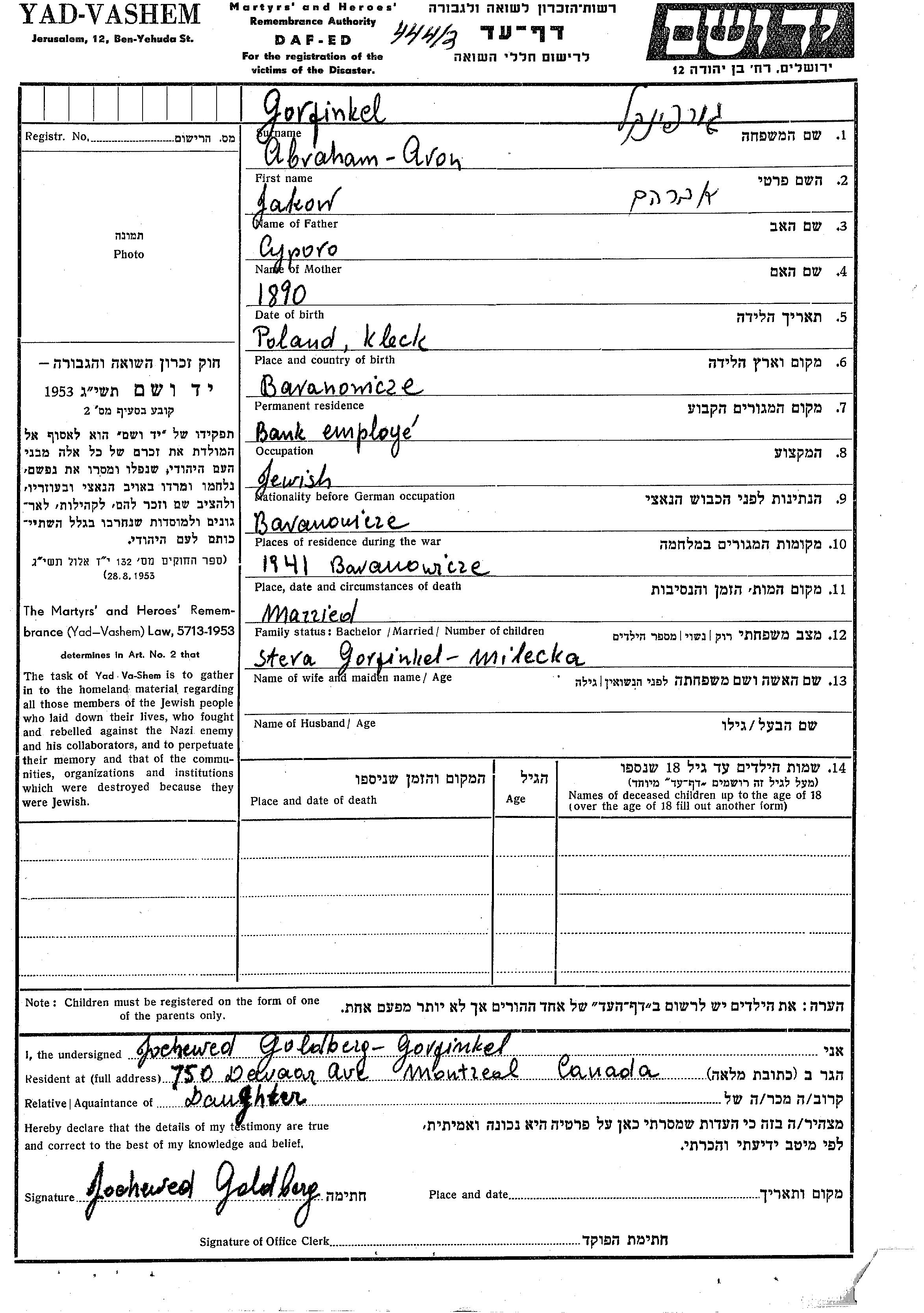 Абраам Арон Горфинкель, место рождения: Клецк, Польша. Отец: Яков, mать:Ципора. Банкир. Женат / замужем. Место жительства до войны: Барановичи, Польша. Место во время войны: Барановичи, Польша.