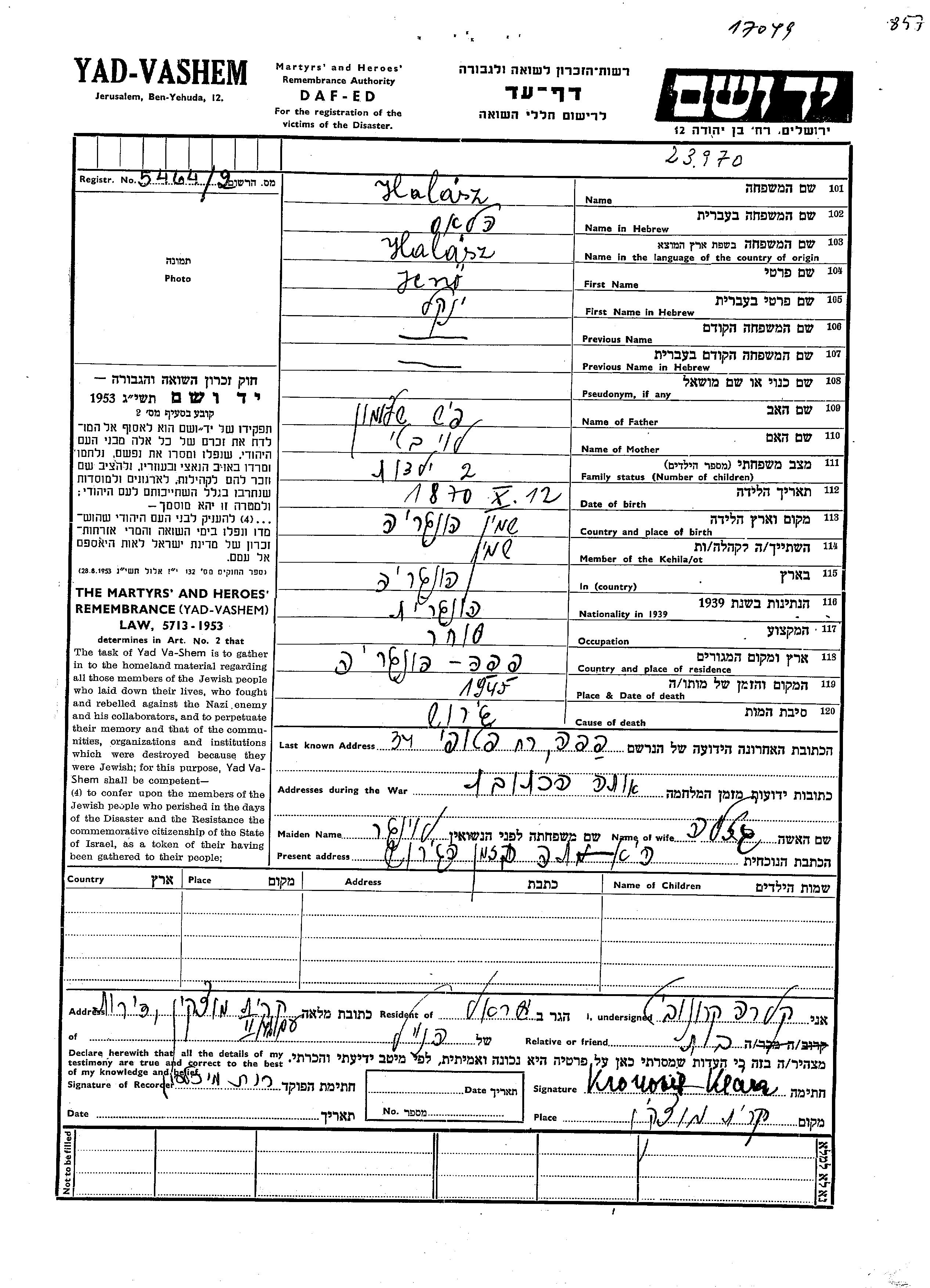 Ено Янкель Халас, место рождения: Самени, Латвия. Отец: Шаломон, mать:Бети. Торговец / торговка. Женат / замужем. Место жительства до войны: Папа, Венгрия. Место во время войны: Папа, Венгрия.