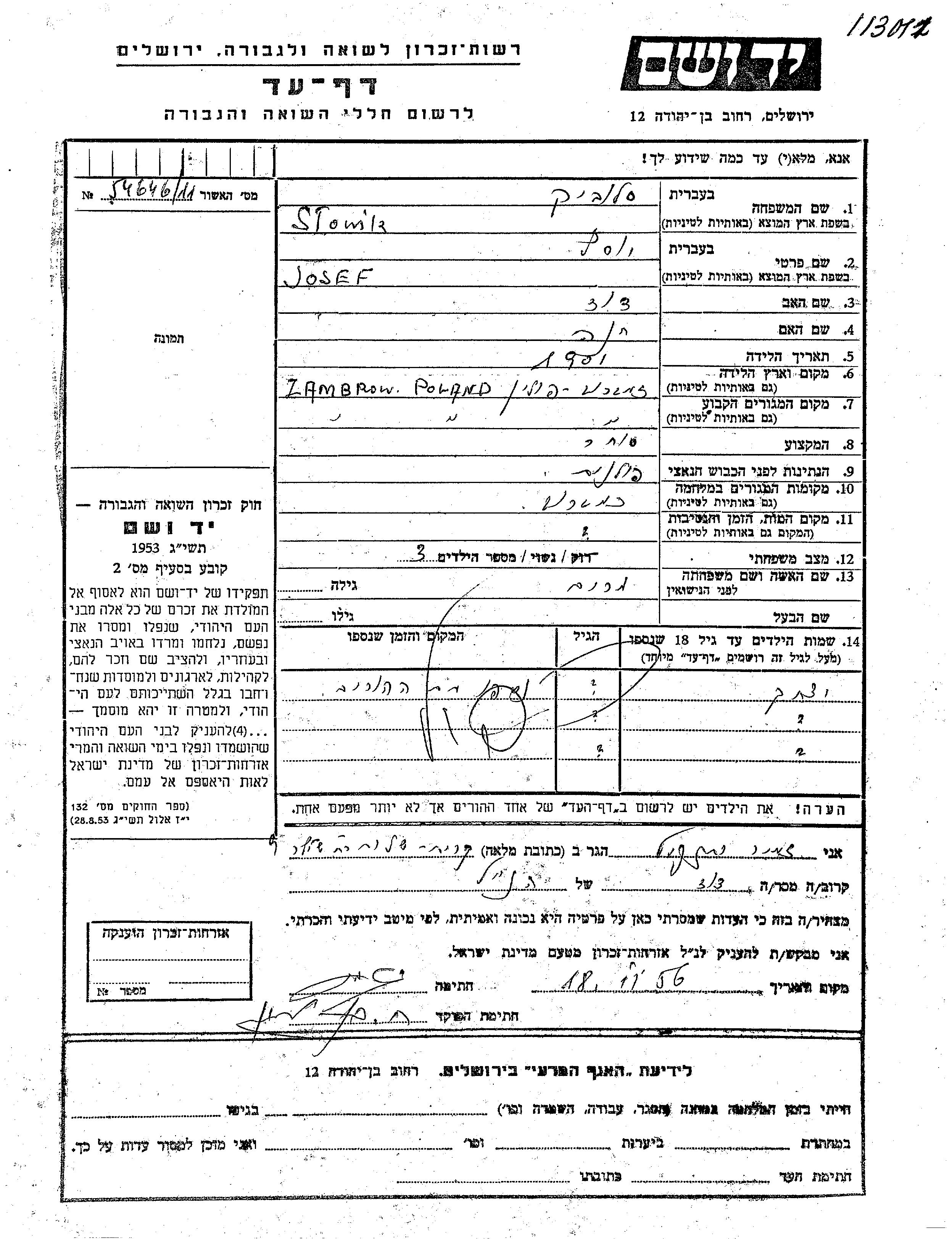 Йосеф Словик, место рождения: Замбрув, Польша. Отец: Давид, mать:Хана. Торговец / торговка. Женат / замужем. Место жительства до войны: Замбрув, Польша. Место во время войны: Замбрув, Польша.