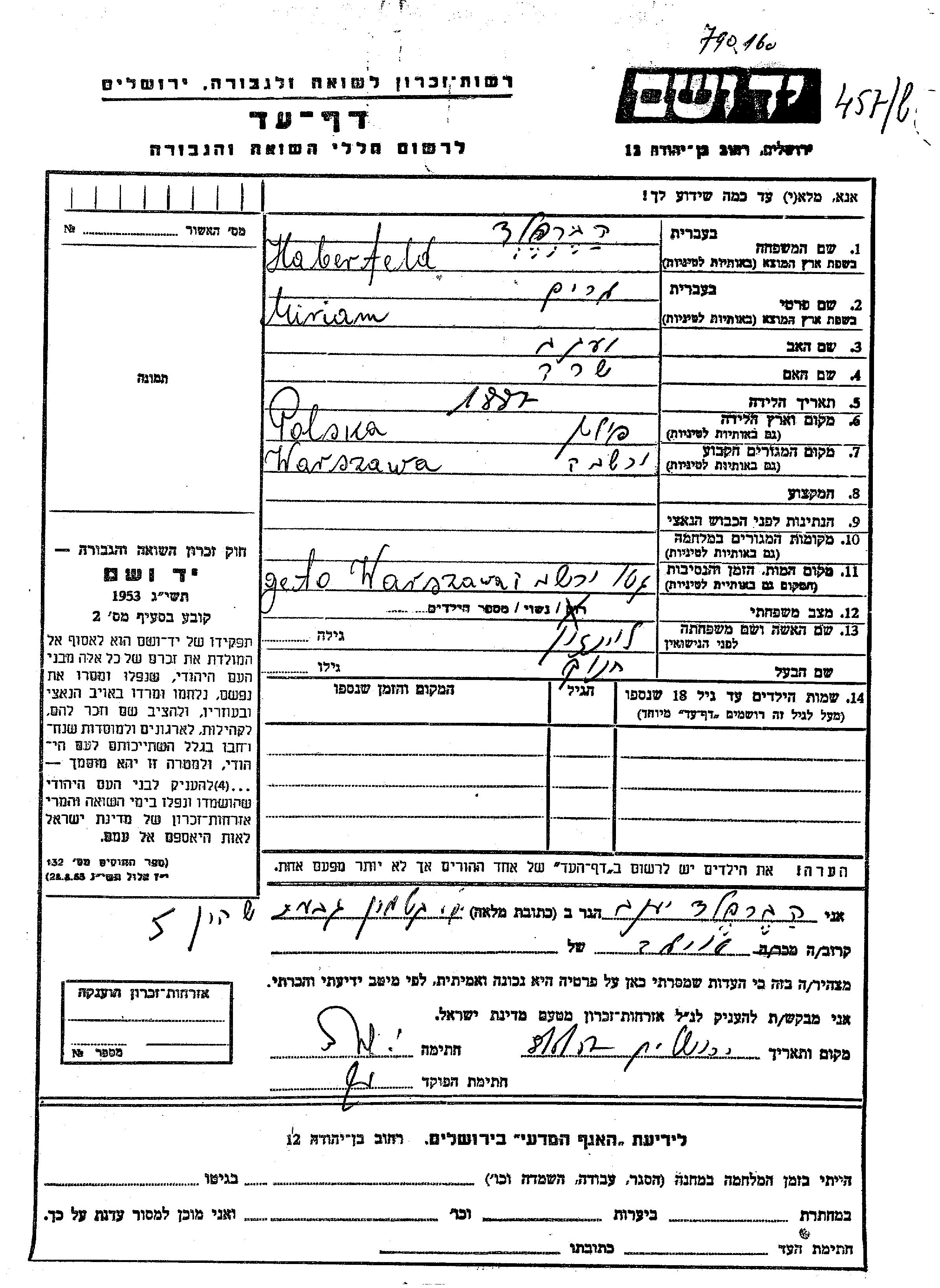 Мирьям Хаберфельд, девичья фамилия Лейнзон, место рождения: Польша. Отец: Яков, mать:Сара. Женат / замужем. Место жительства до войны: Варшава, Польша.