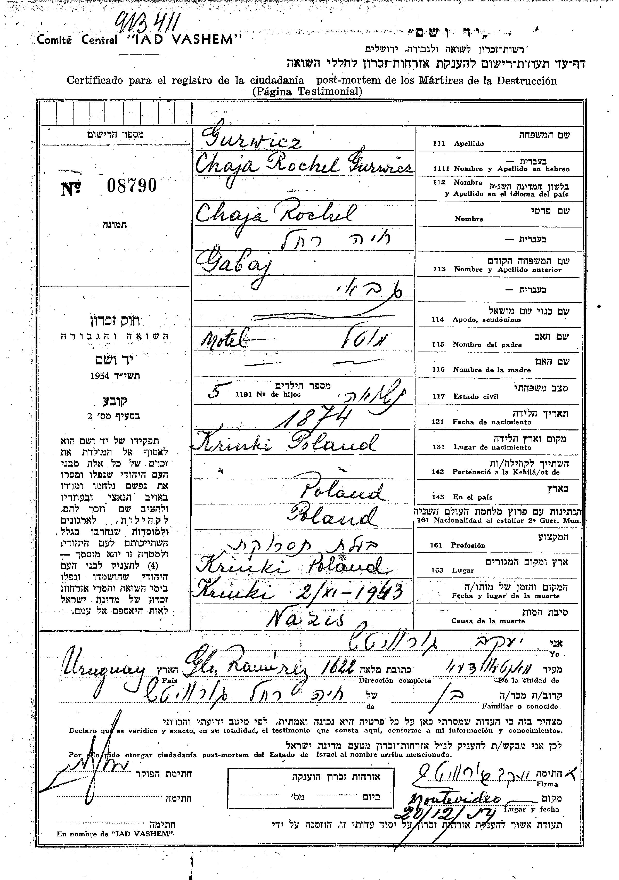 Хая Рохель Гурвич, девичья фамилия Габай, место рождения: Крынки, Польша. Отец: Мотел. Хозяйка салона красоты. Женат / замужем. Место жительства до войны: Крынки, Польша. Место во время войны: Крынки, Польша.