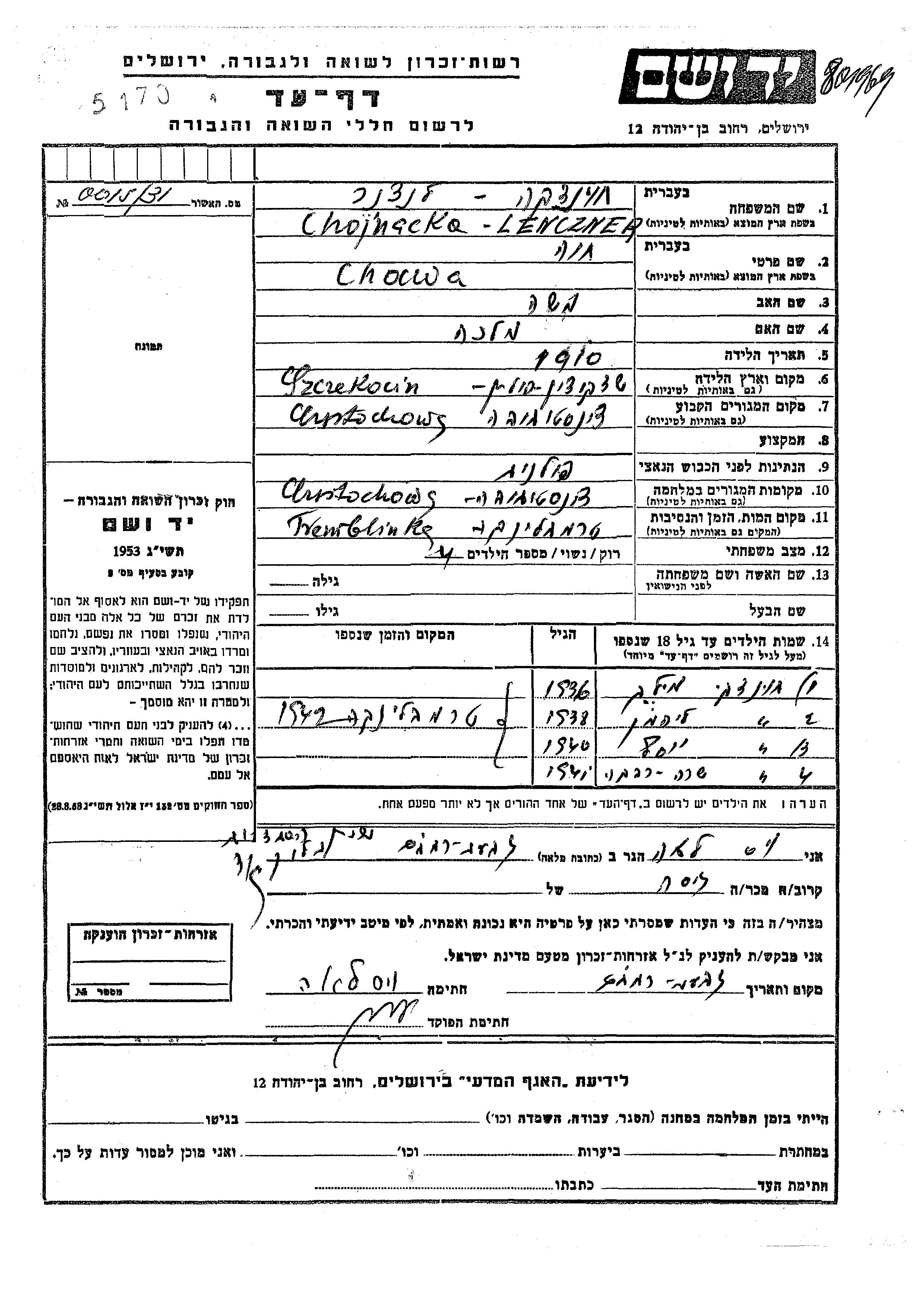 Хойнацка Ленчнер Хава 1910 Ченстохова, Польша Лист свидетельских показаний