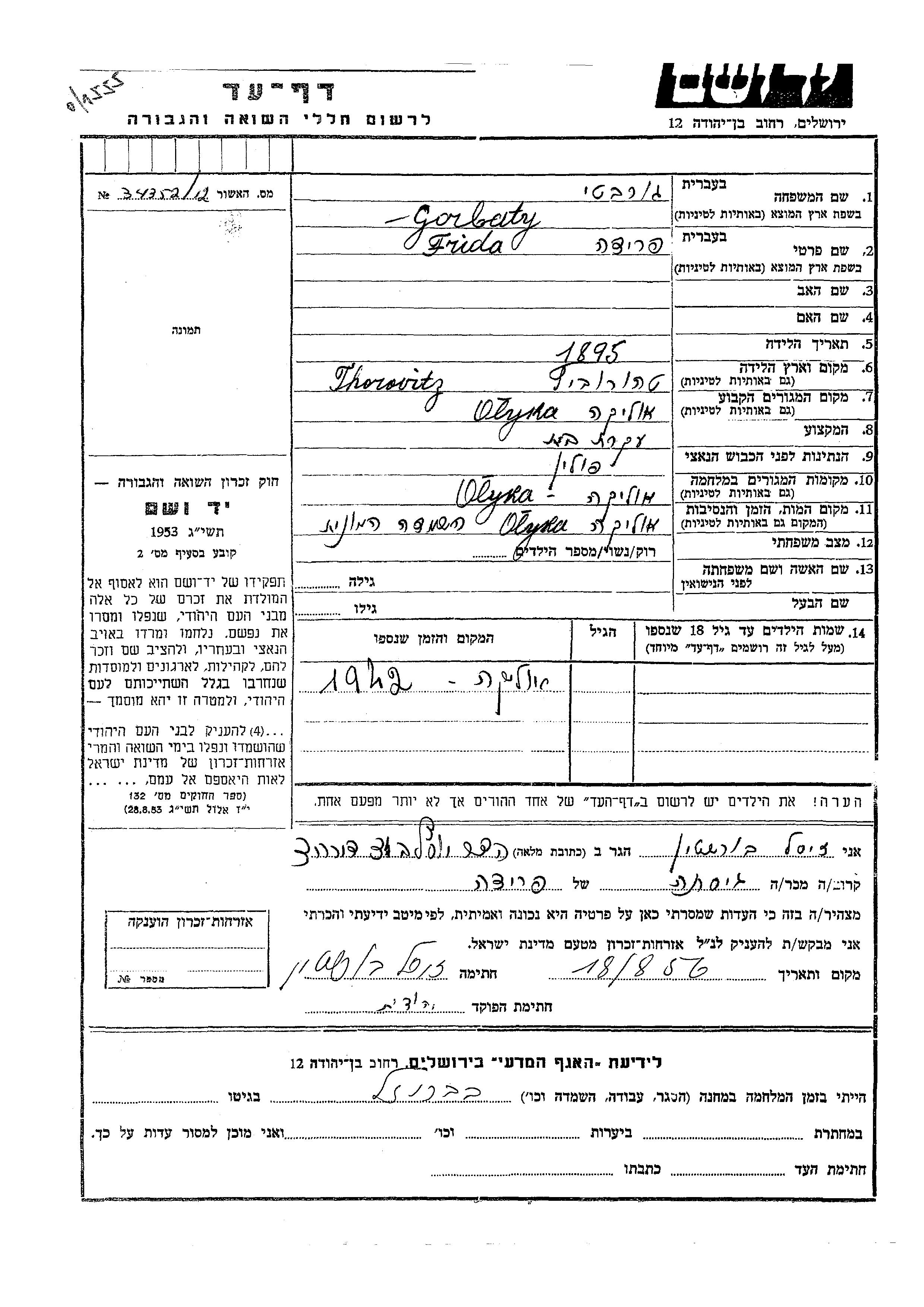 Фрида Горбатый, место рождения: Туровичи, Польша. Домохозяйка. Место жительства до войны: Олыка, Польша. Место во время войны: Олыка, Польша.