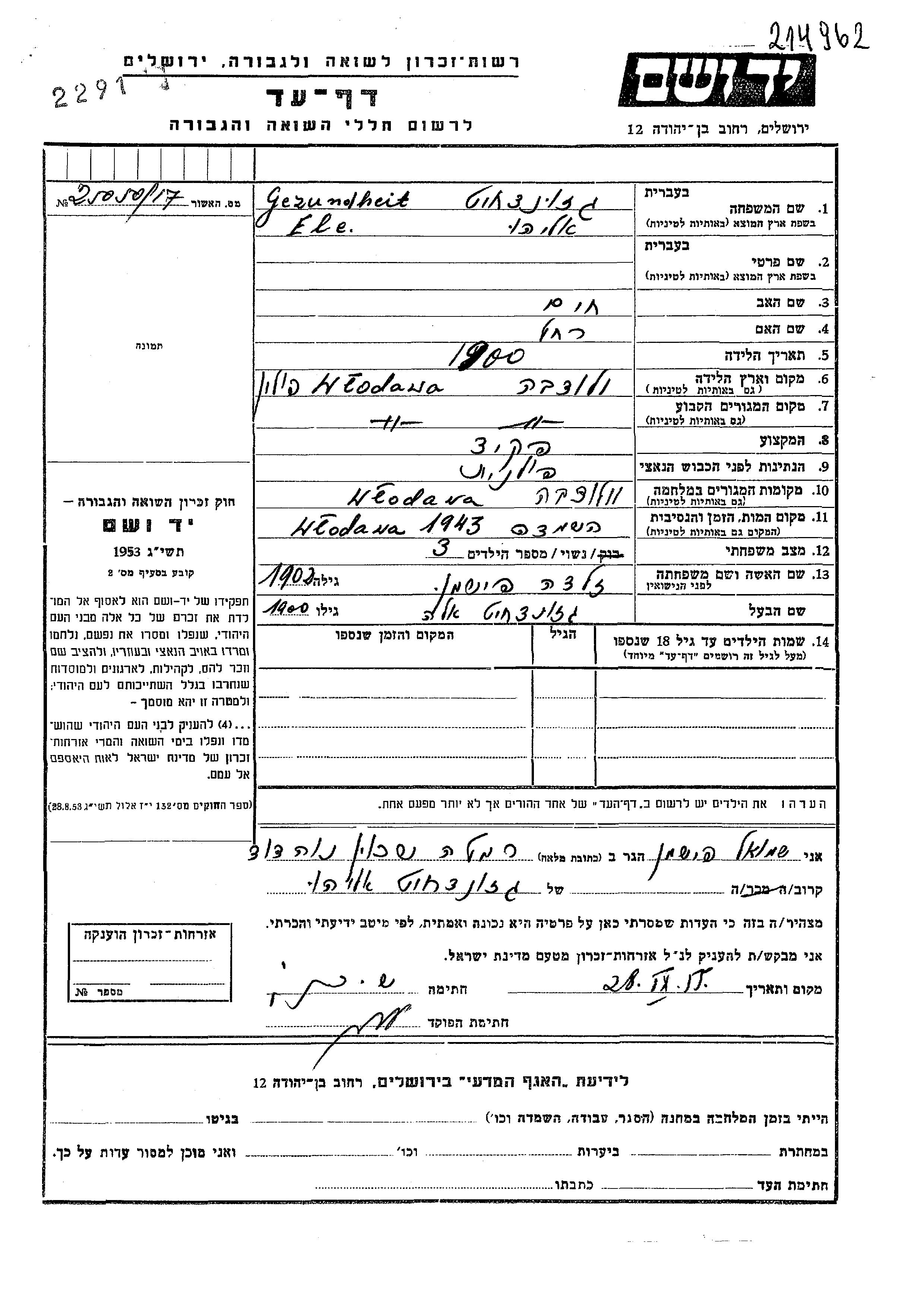 Эле Гезундхейт, девичья фамилия Фишман родился/родилась, место рождения: Влодава, Польша. Отец: Хаим, mать:Рахель. Клерк. Женат / замужем. Место жительства до войны: Влодава, Польша. Место во время войны: Влодава, Польша.