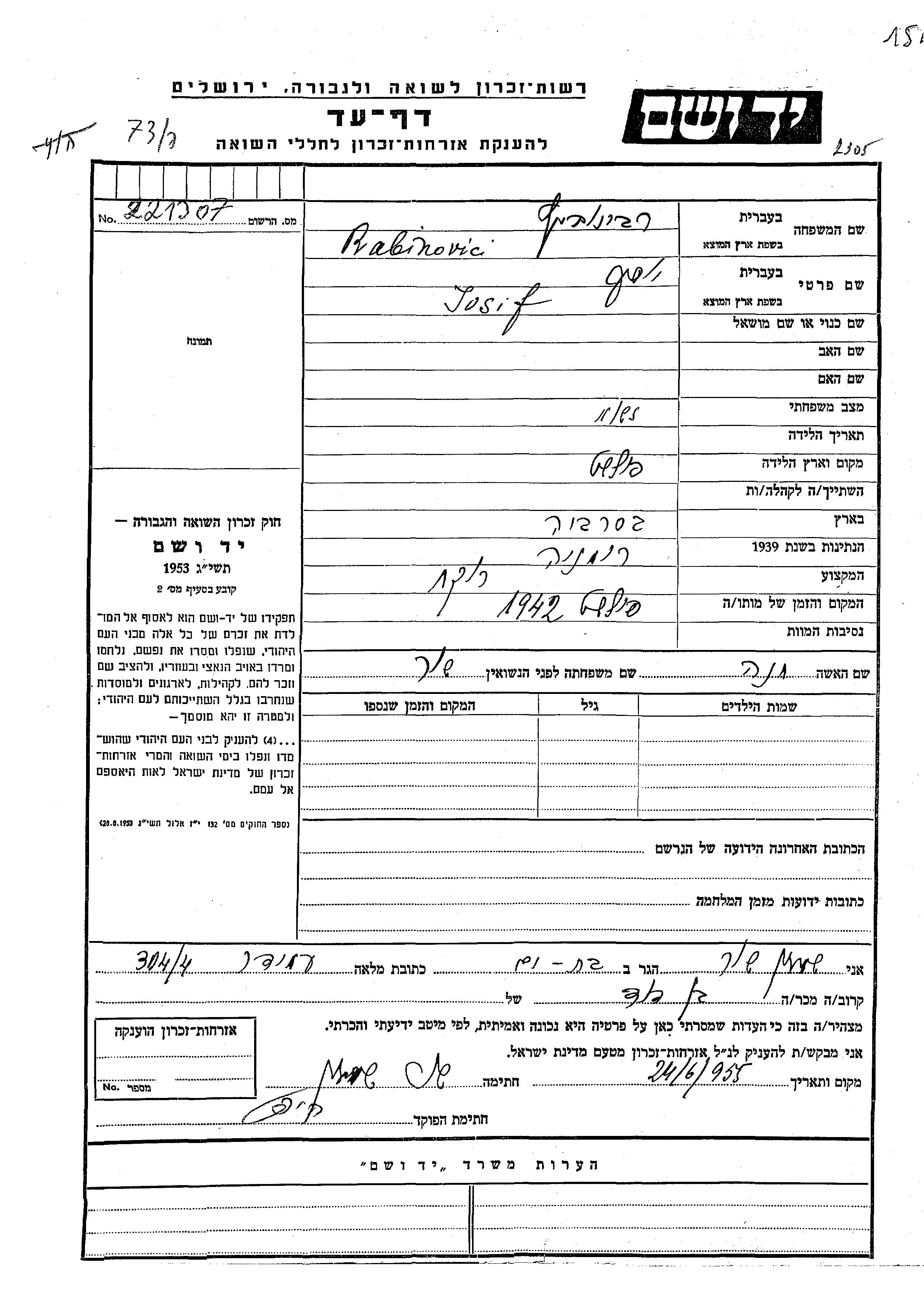 Рабинович Йосиф место не указано, Лист свидетельских показаний