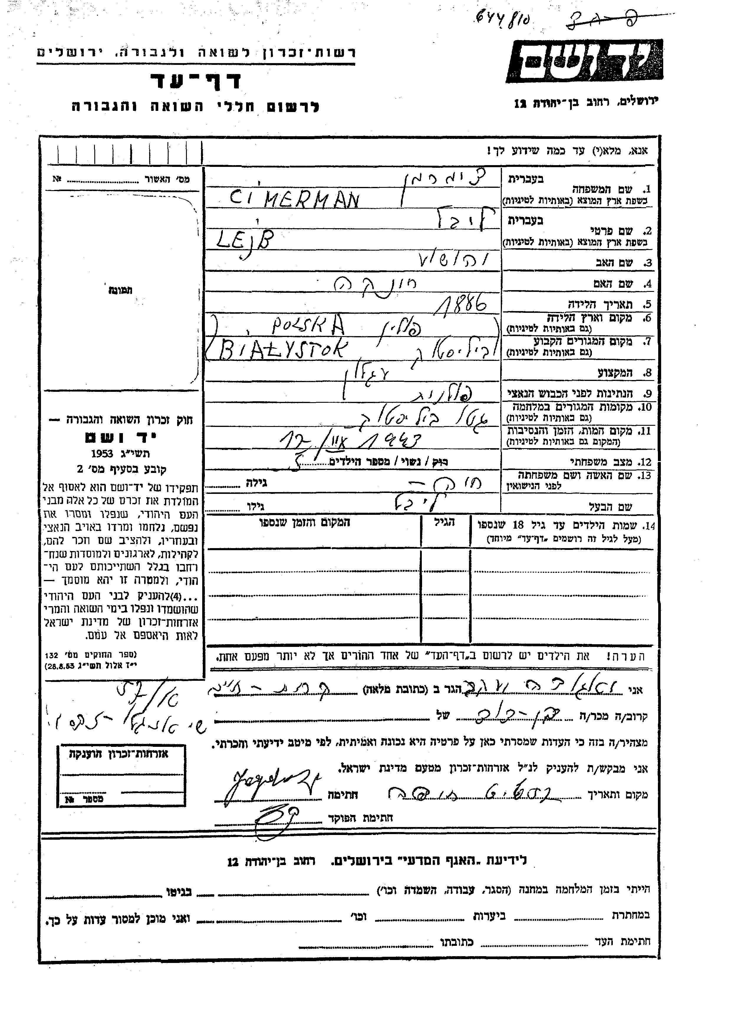 Лейб Цимерман, место рождения: Белосток, Польша. Отец: Иегошуа, mать:Хинка. Извозчик. Женат / замужем. Место жительства до войны: Белосток, Польша. Место во время войны: Белосток, Польша.