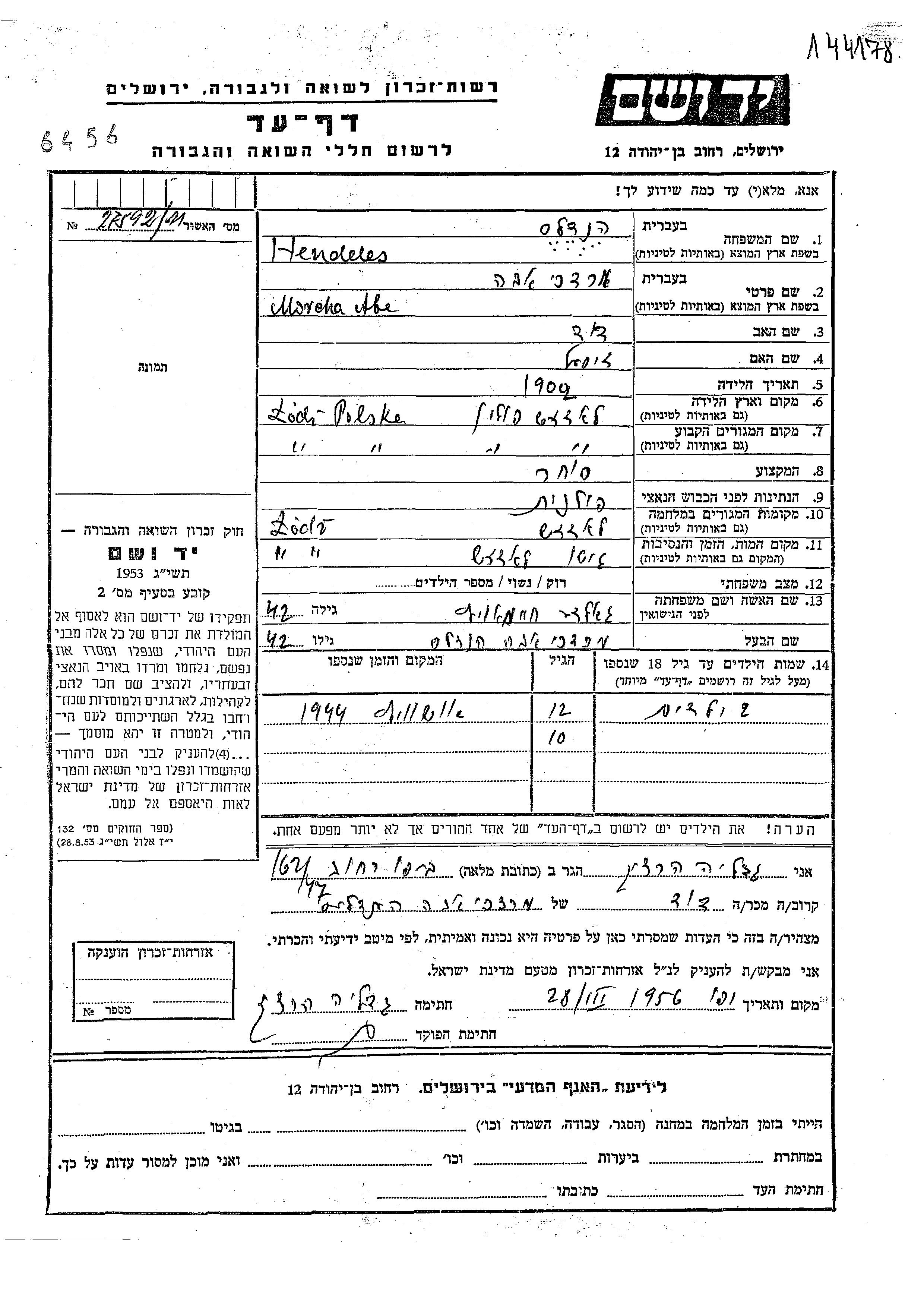 Морха Абе Хендлес, место рождения: Лодзь, Польша. Отец: Давид, mать:Зисел. Торговец / торговка. Женат / замужем. Место жительства до войны: Лодзь, Польша. Место во время войны: Лодзь, Польша.