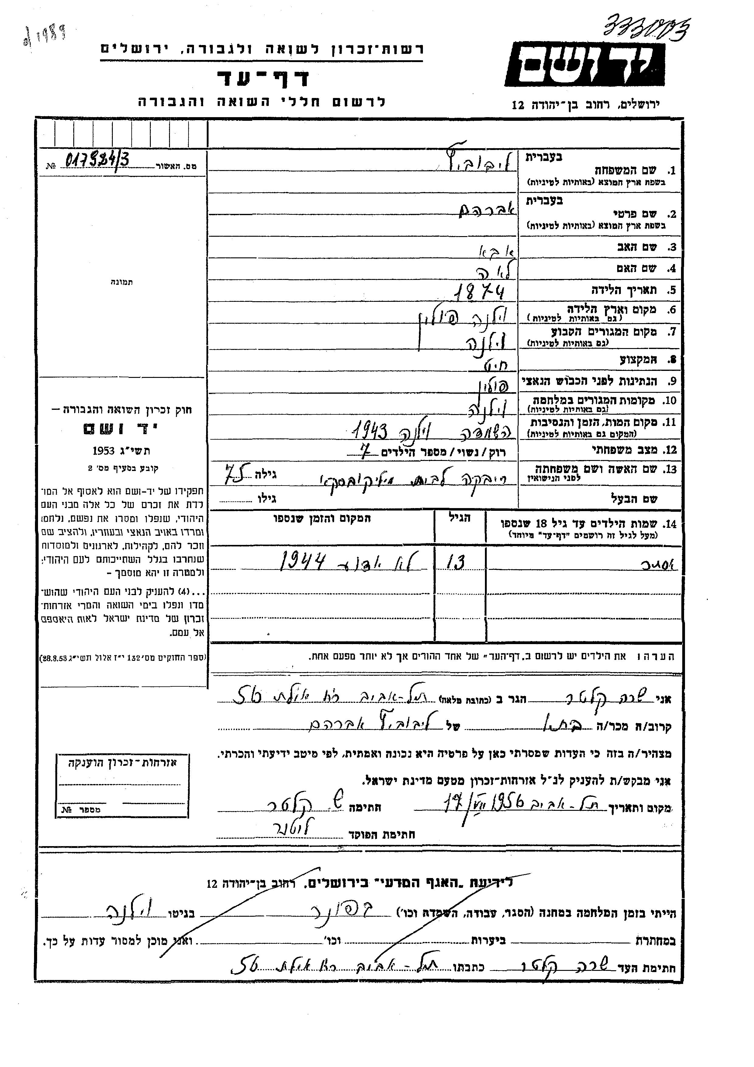 Яд Вашем - Листы свидетельских показаний Мемориального фонда