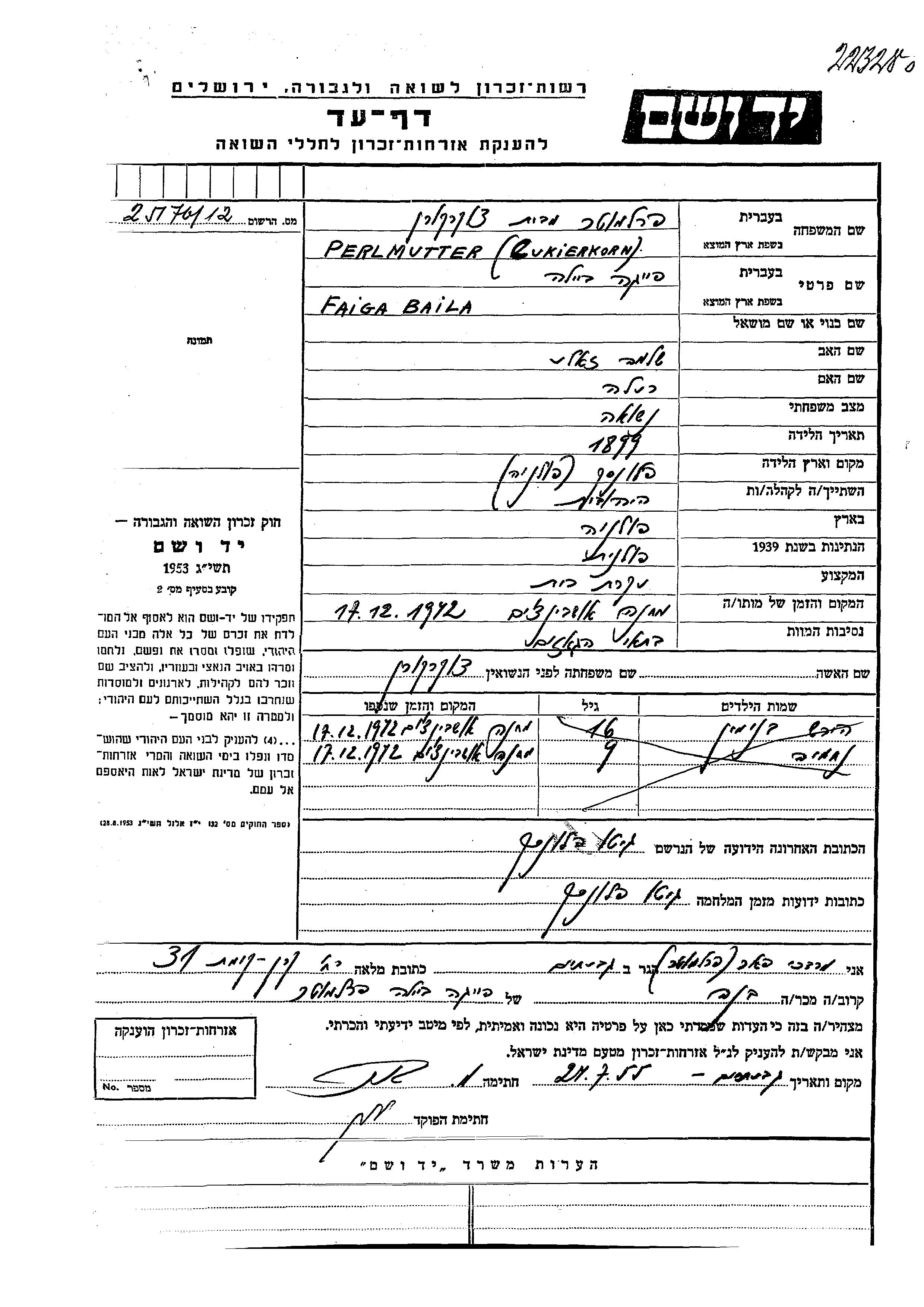 Файга Баила Перльмуттер, девичья фамилия Цукеркорн, место рождения: Плоньск, Польша. Отец: Шломо Зале, mать:Рела. Домохозяйка. Женат / замужем. Место жительства до войны: Плоньск, Польша. Место во время войны: Плоньск, Польша.