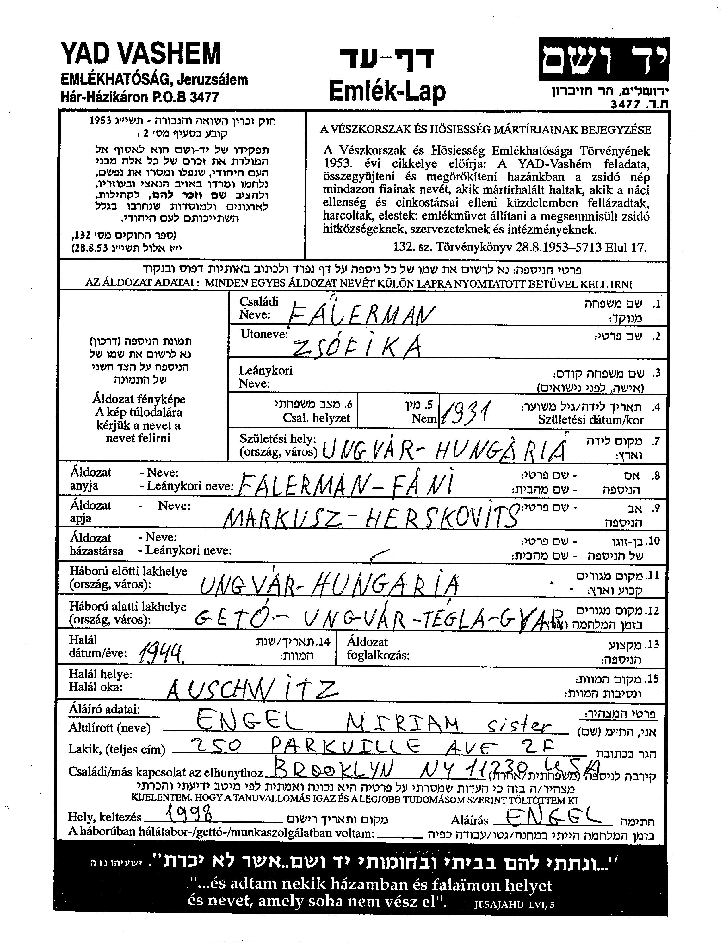 Файерман Хершковиц Жофика 1931 Унгвар, Чехословакия Лист свидетельских показаний