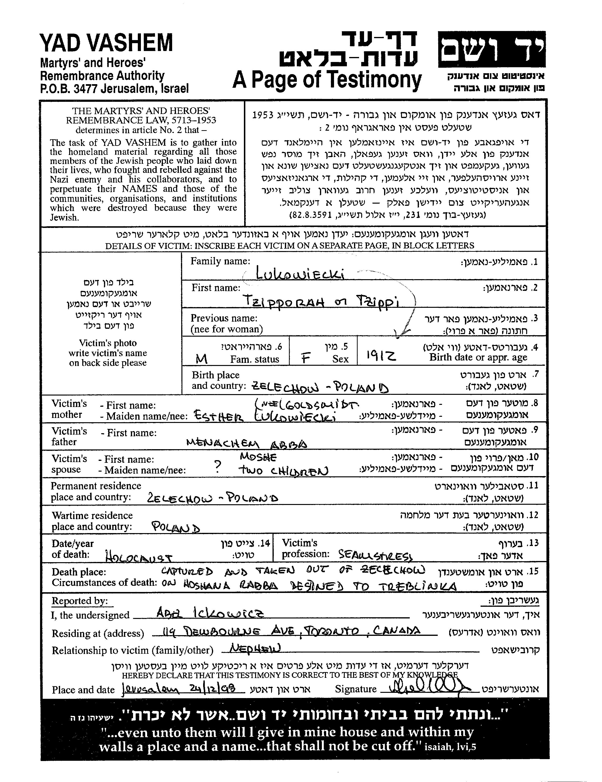 Луковецки Ципора 1912 Желехув, Польша Лист свидетельских показаний