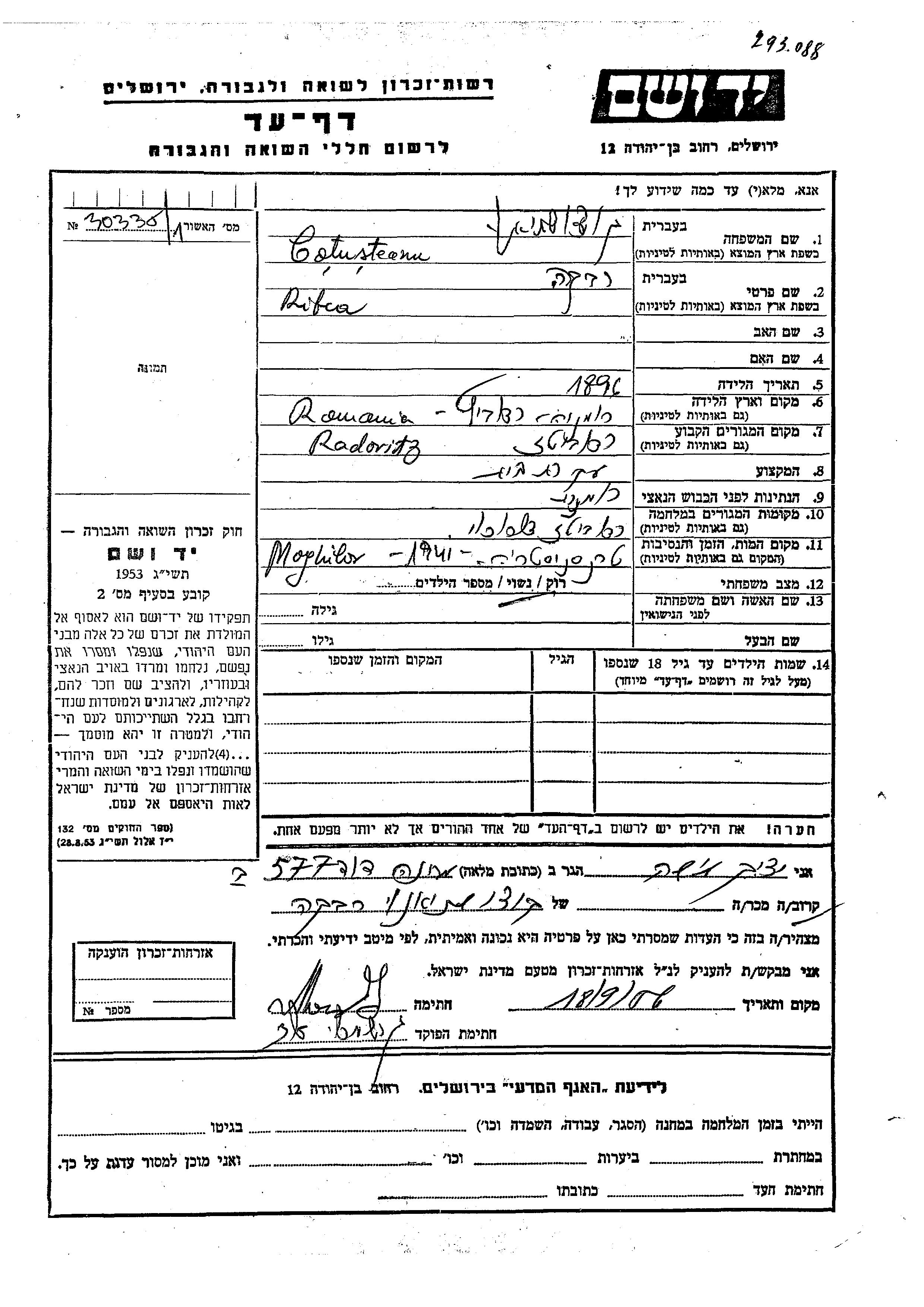 Рифка Коцуштяну, место рождения: Рэдэуци, Румыния. Домохозяйка. Холост / не замужем. Место жительства до войны: Рэдэуци, Румыния. Место во время войны: Рэдэуци, Румыния.
