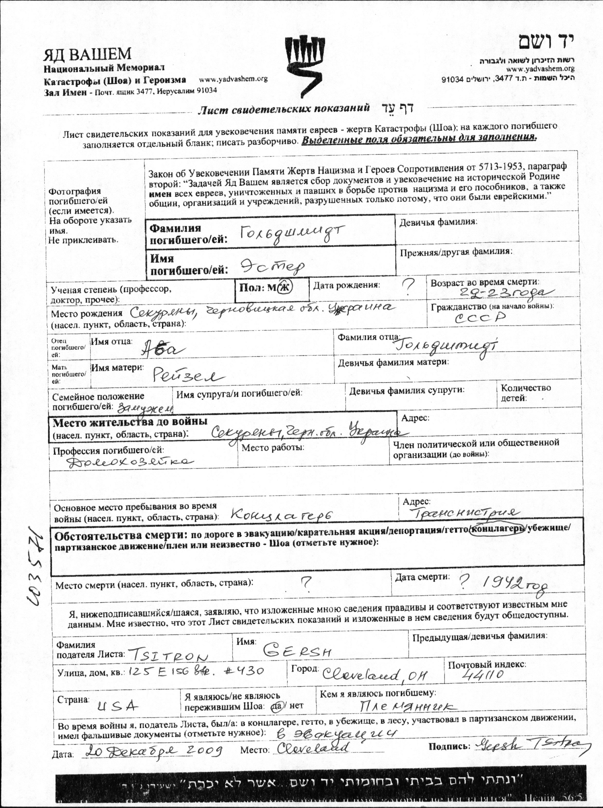 Эстер Гольдшмидт, место рождения: Секуряны Сат, Румыния. Отец: Аба, mать:Рейзель. Домохозяйка. Женат / замужем. Место жительства до войны: Секуряны Сат, Румыния. Место во время войны: Транснистрия, Украина (СССР).