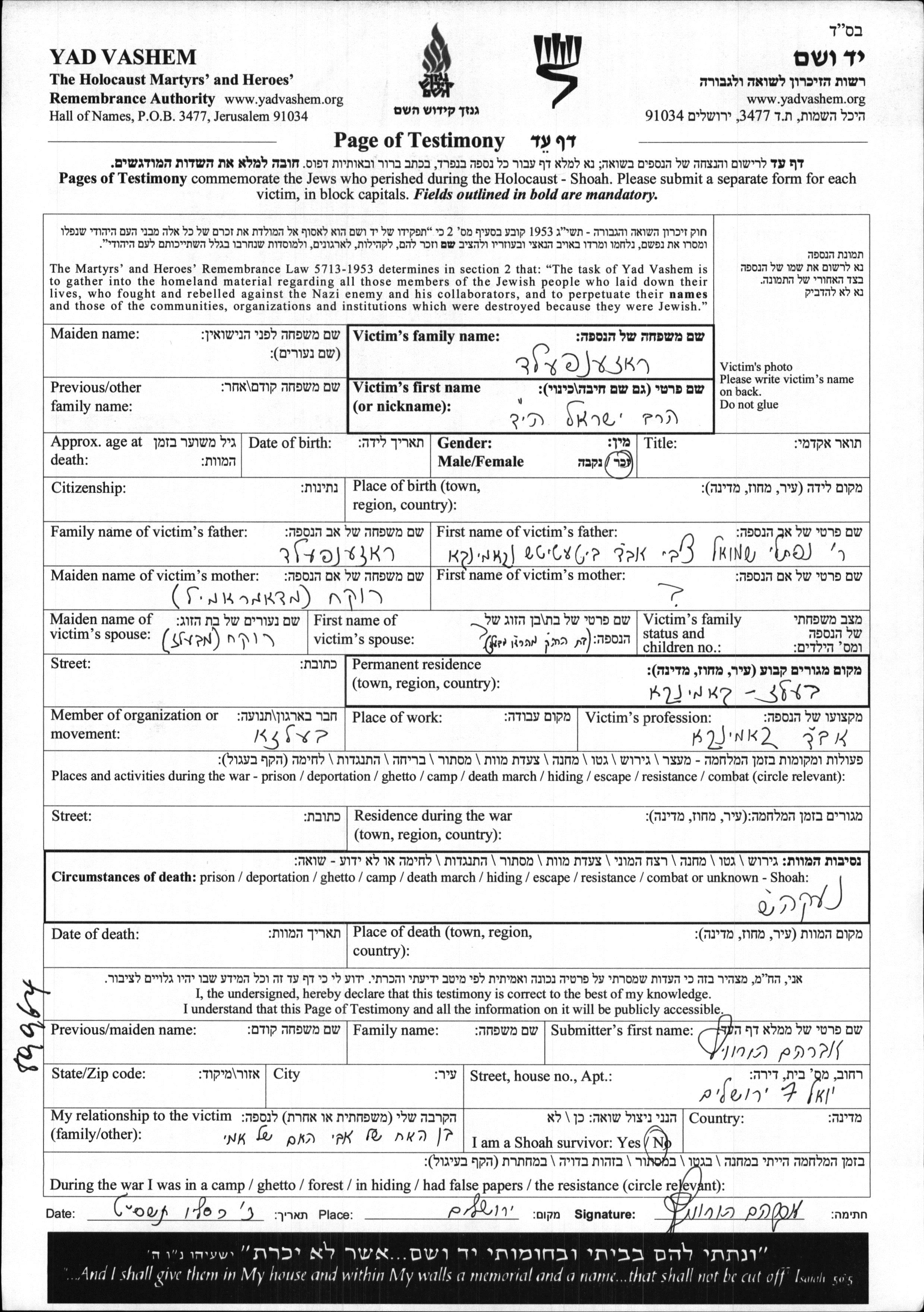 Яд Вашем - Листы свидетельских показаний Мемориального фонда