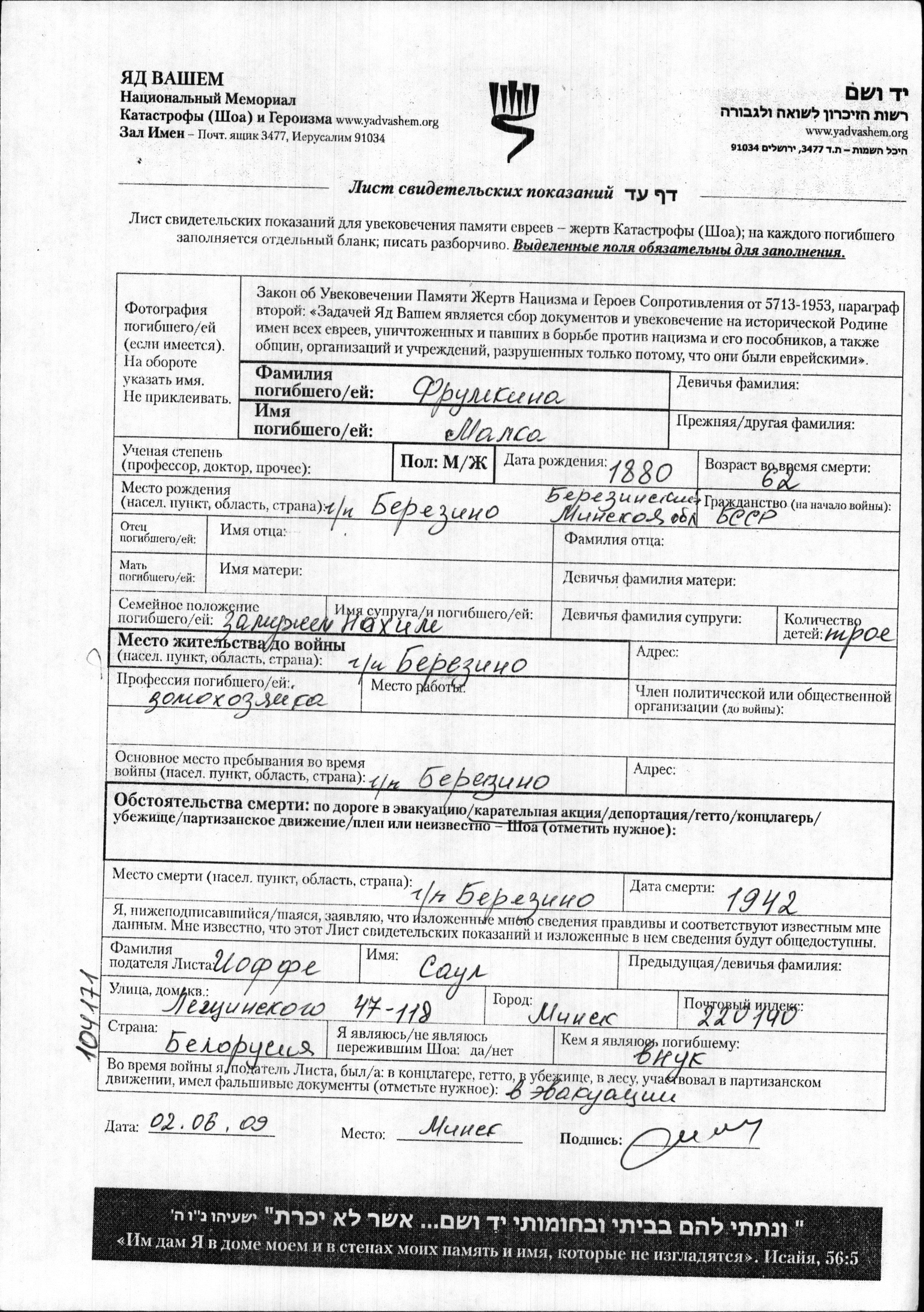 Фрумкина Малка 1880 Березино, Белоруссия (СССР) Лист свидетельских показаний