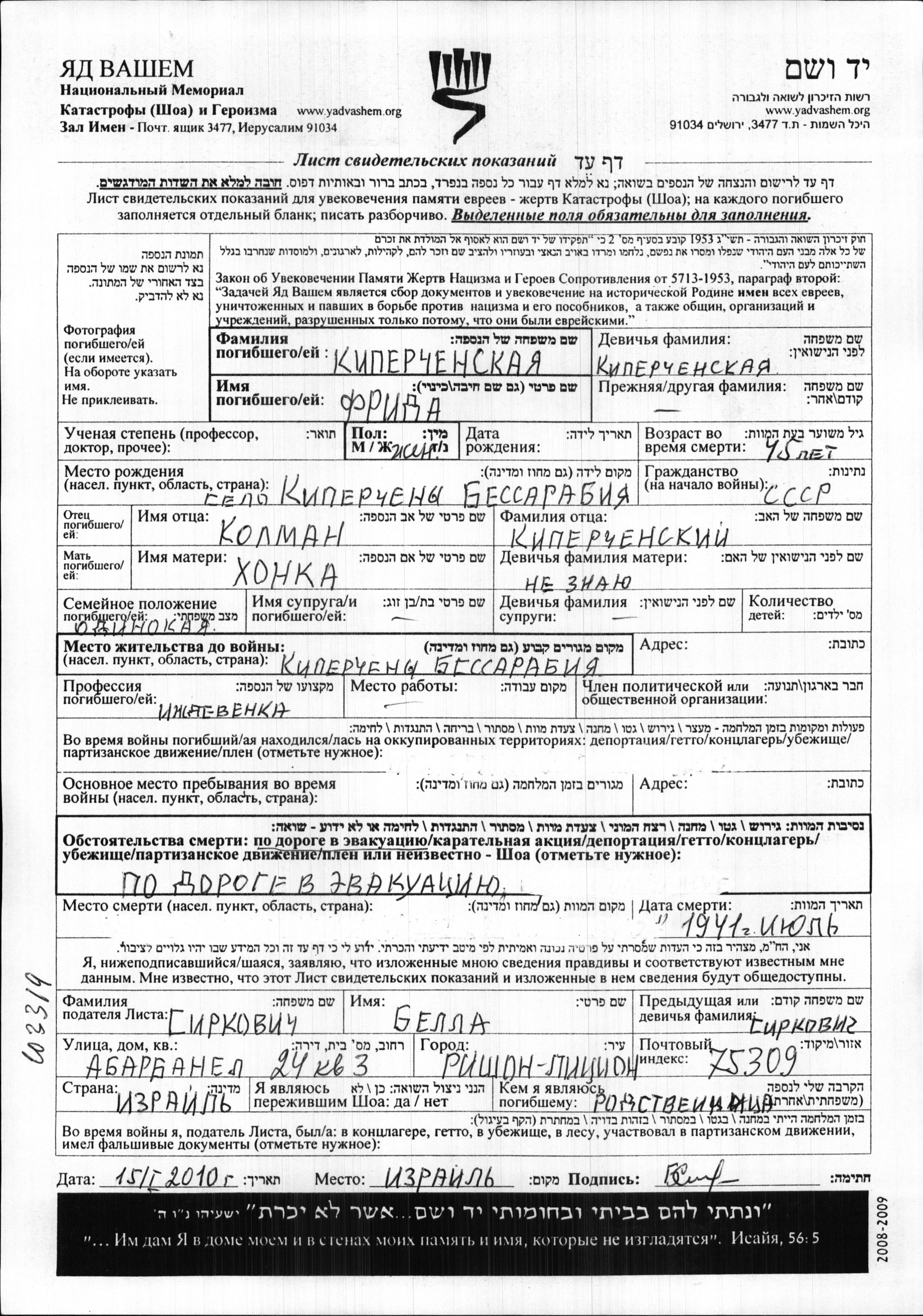 Фрида Киперченская, место рождения: Киперчень, Румыния. Отец: Кольман, mать:Хонка. Иждивенец / иждивенка. Холост / не замужем. Место жительства до войны: Киперчень, Румыния. Фрида уничтоженa в период Шоа. место смерти: неизвестно в 07/1941.