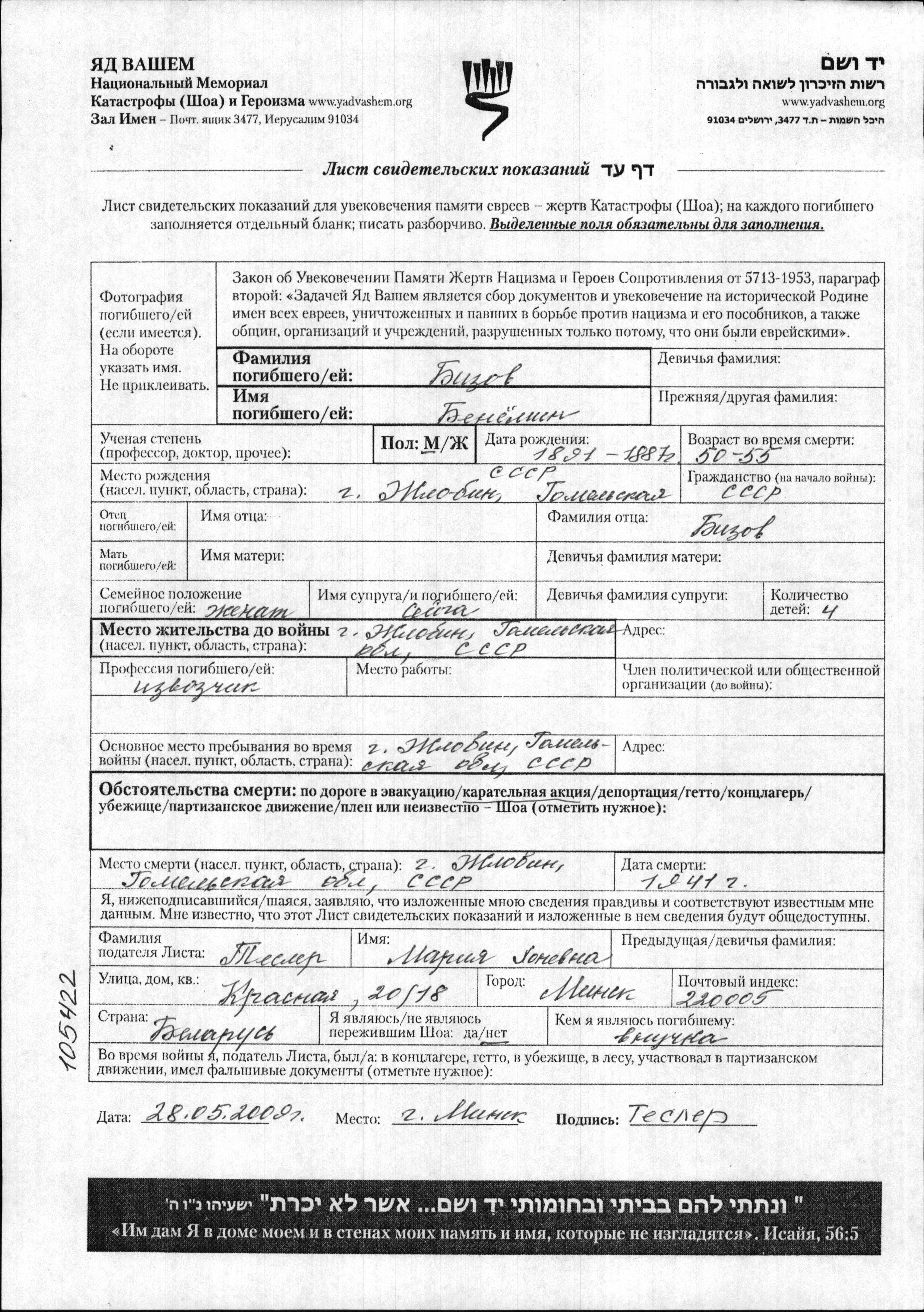 Бизов Беньямин 1891 Жлобин, Белоруссия (СССР) Лист свидетельских показаний