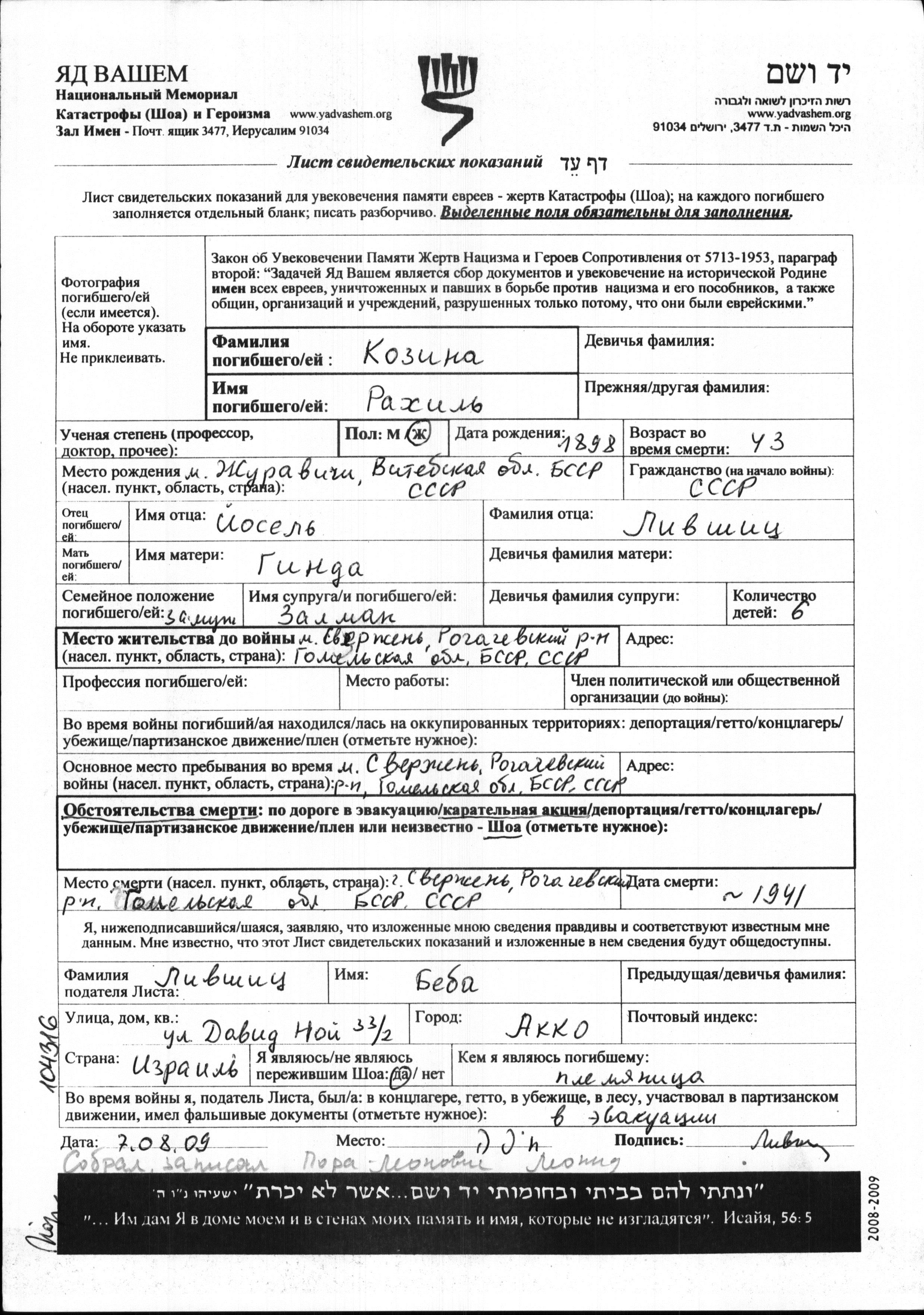 Рахиль Козина, девичья фамилия Лившиц, место рождения: Журавичи, Белоруссия (СССР). Отец: Йосел, mать:Гинда. Женат / замужем. Место жительства до войны: Свержень, Белоруссия (СССР). Место во время войны: Свержень, Белоруссия (СССР).