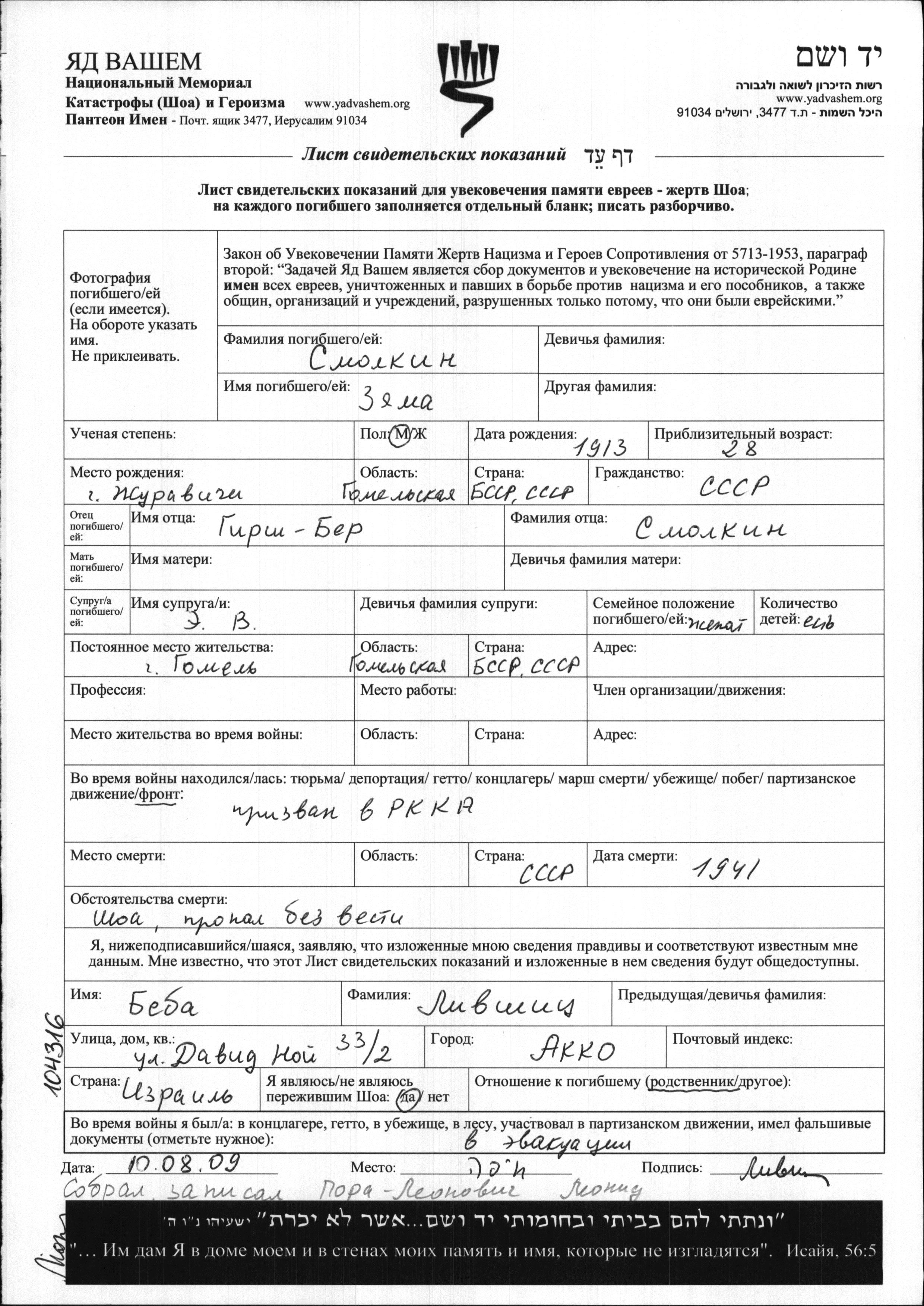 Смолкин Зяма 1913 Гомель, Белоруссия (СССР) Лист свидетельских показаний