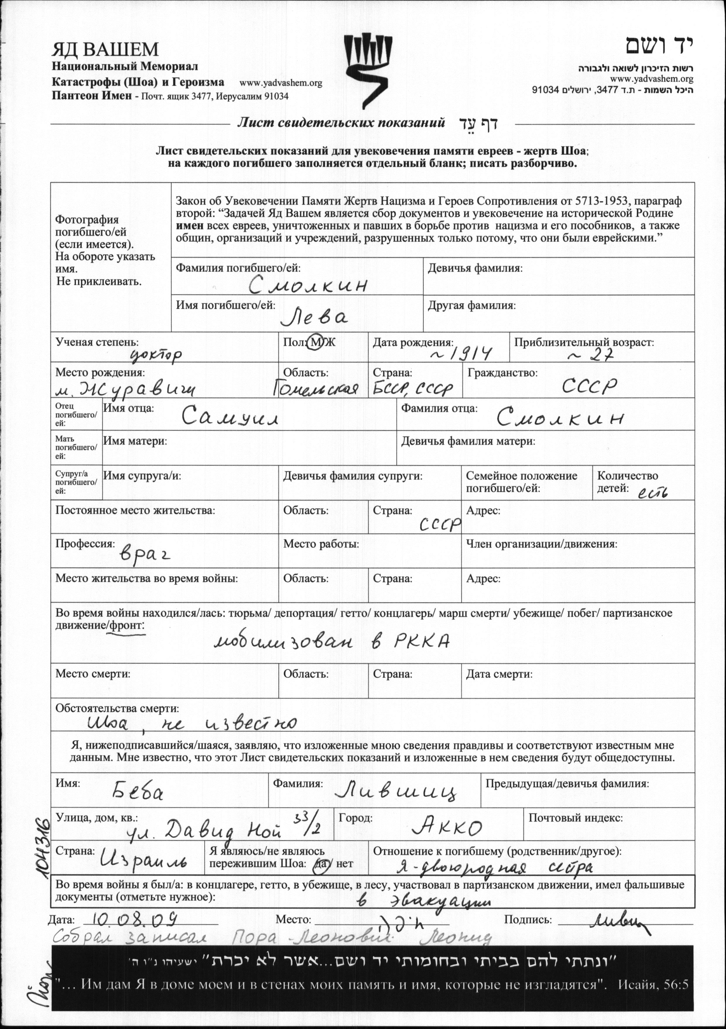 Смолкин Лева 1914 Журавичи, Белоруссия (СССР) Лист свидетельских показаний