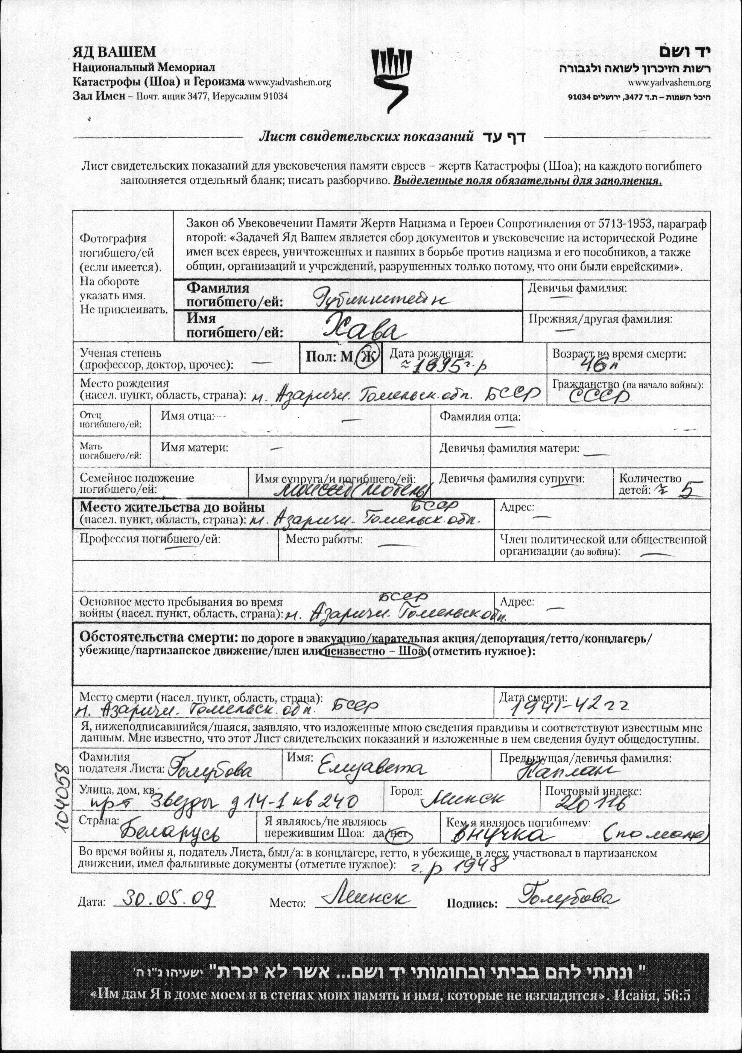 Яд Вашем - Листы свидетельских показаний Мемориального фонда