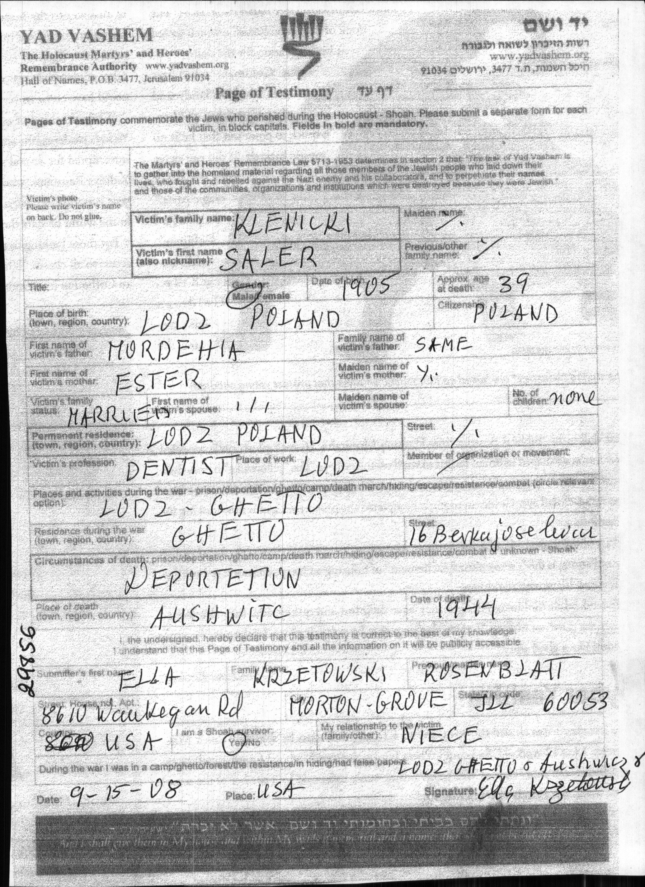 Салер Кленицки, место рождения: Лодзь, Польша. Отец: Мордехай, mать:Эстер. Зубной врач. Женат / замужем. Место жительства до войны: Лодзь, Польша. Место во время войны: Лодзь, Польша.