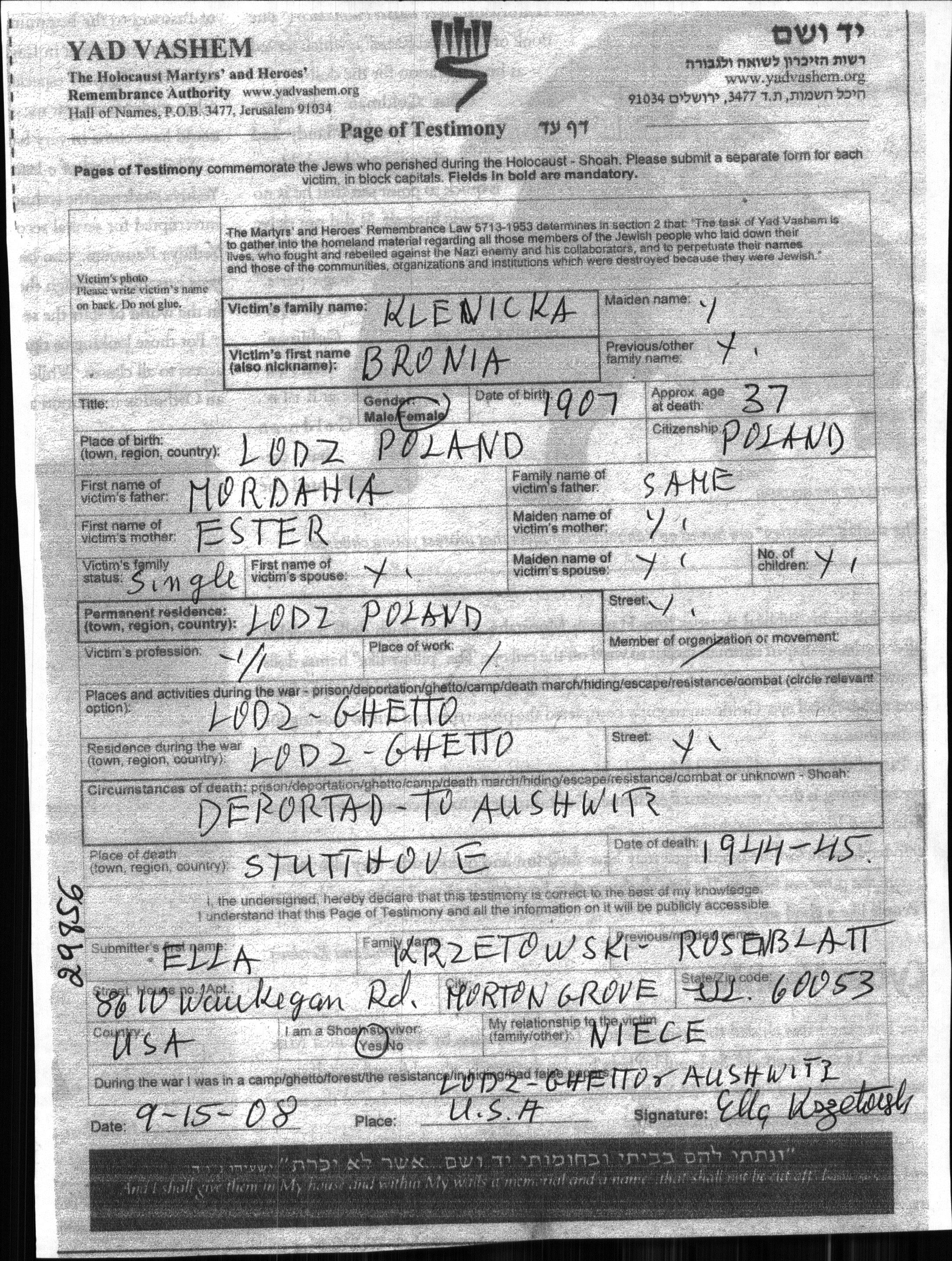 Броня Кленицка, место рождения: Лодзь, Польша. Отец: Мордахия, mать:Эстер. Холост / не замужем. Место жительства до войны: Лодзь, Польша. Место во время войны: Лодзь, Польша.