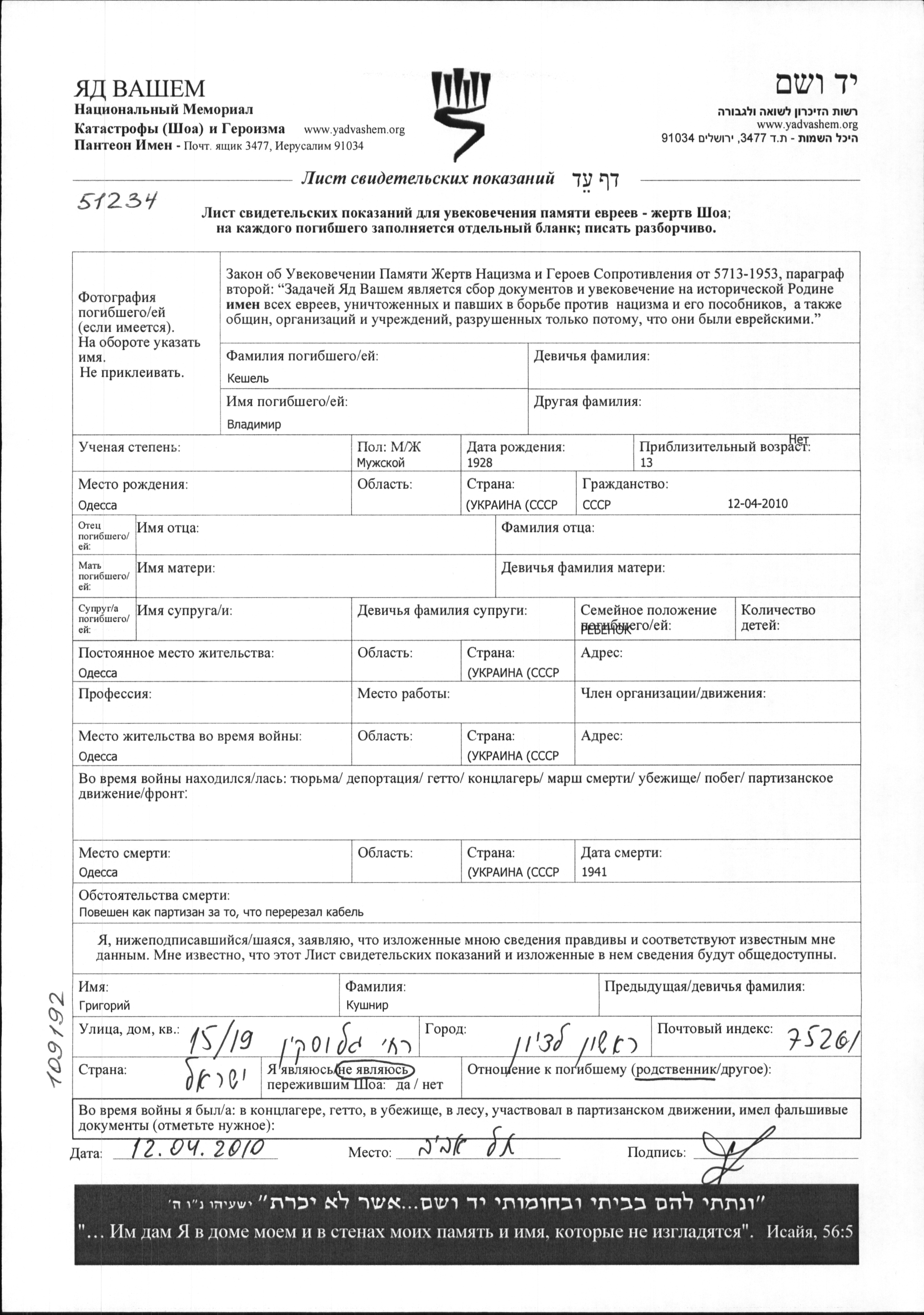 Кешель Владимир 1928 Одесса, Украина (СССР) Лист свидетельских показаний (электронный, с подписью)