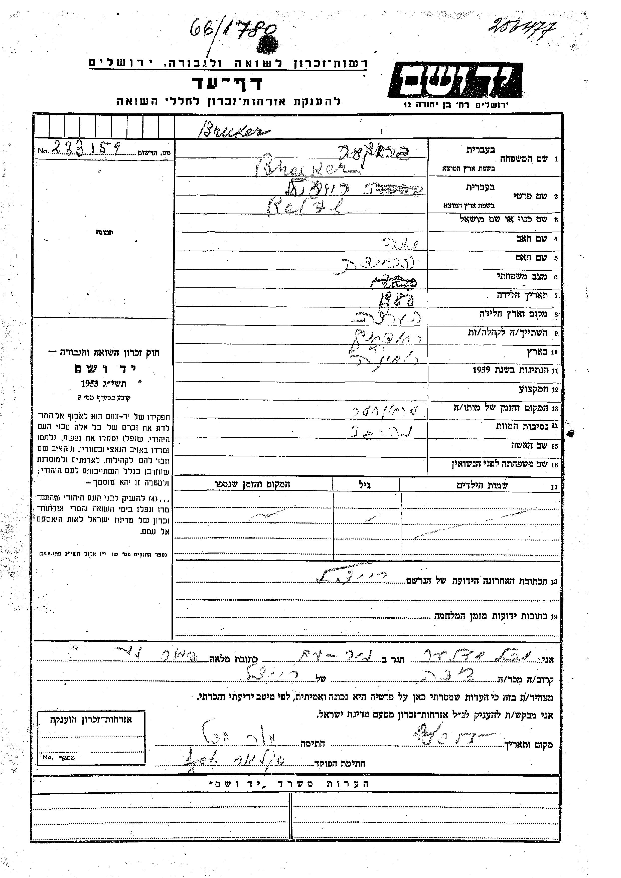 Рейзл Брукер, место рождения: Херца, Румыния. Отец: Моше, mать:Фрейда. Место жительства до войны: Рэдэуци, Румыния.