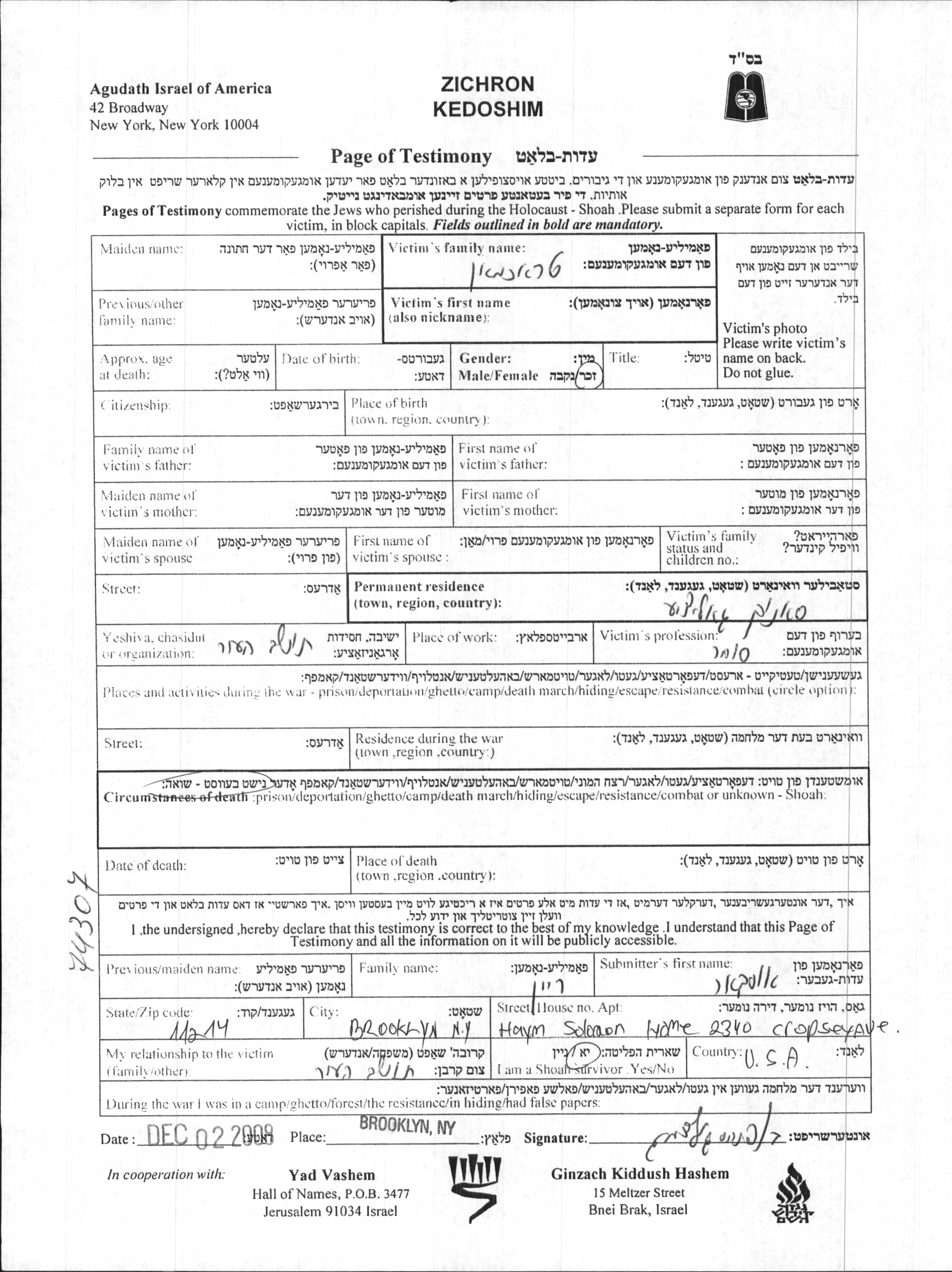 Яд Вашем - Листы свидетельских показаний Мемориального фонда