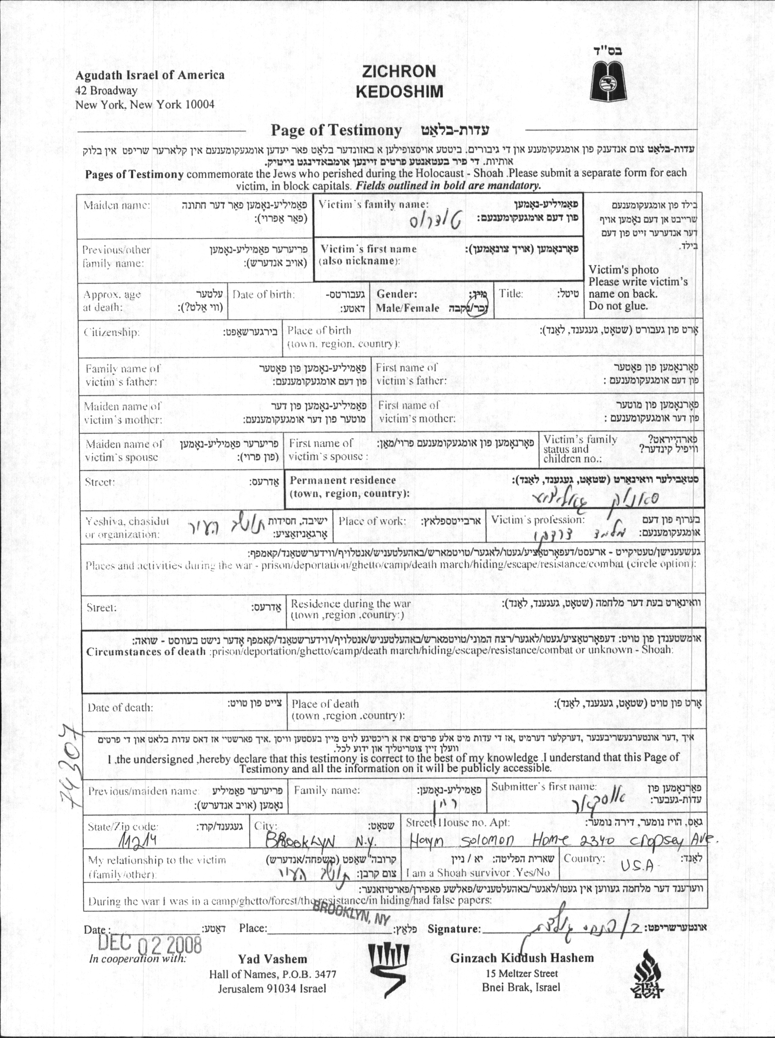 Яд Вашем - Листы свидетельских показаний Мемориального фонда
