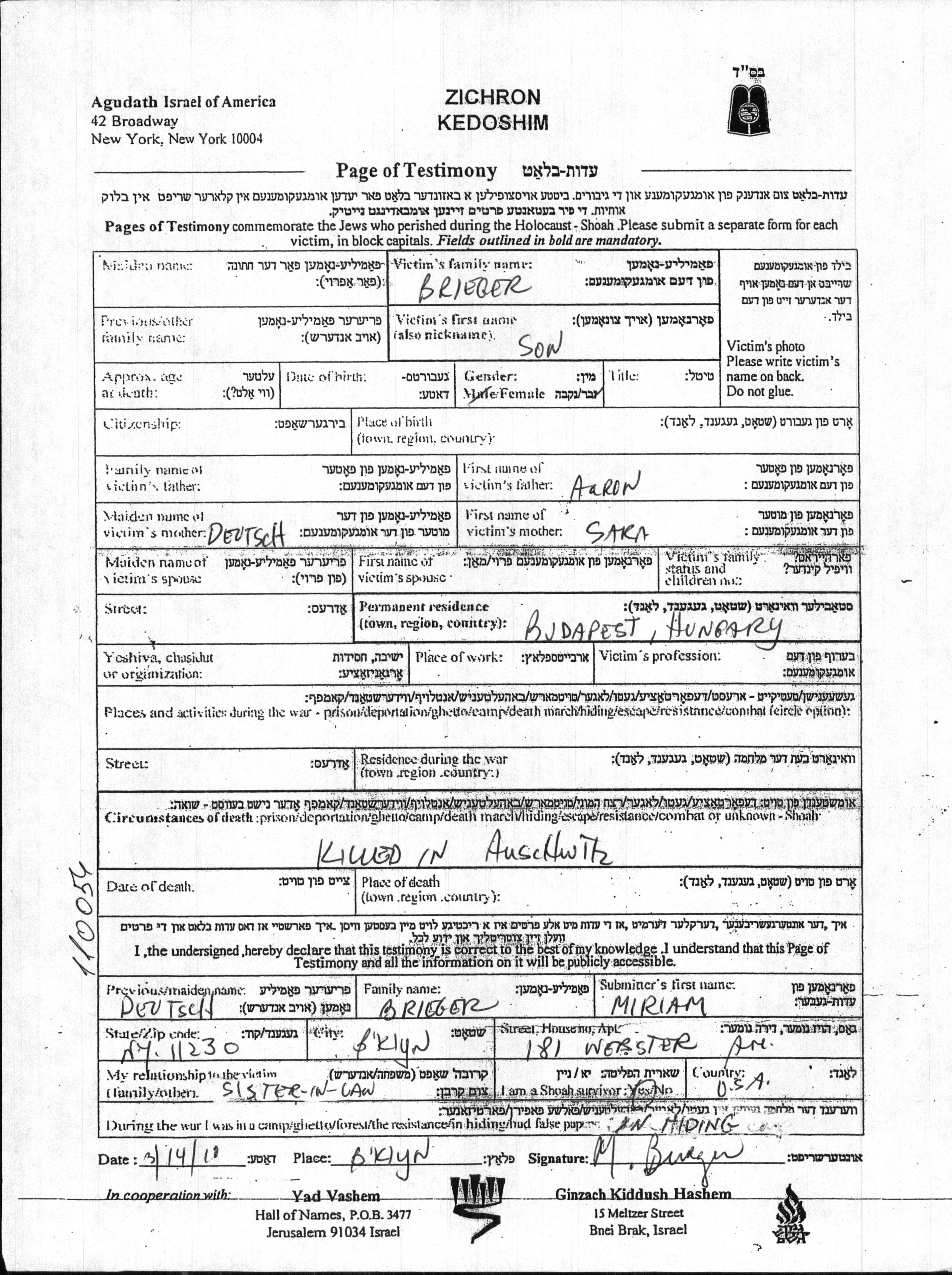Имя неизвестно Бригер Аарон Сара девичья фамилия Дойч. Место жительства до войны: Румыния. Место во время войны: Румыния.