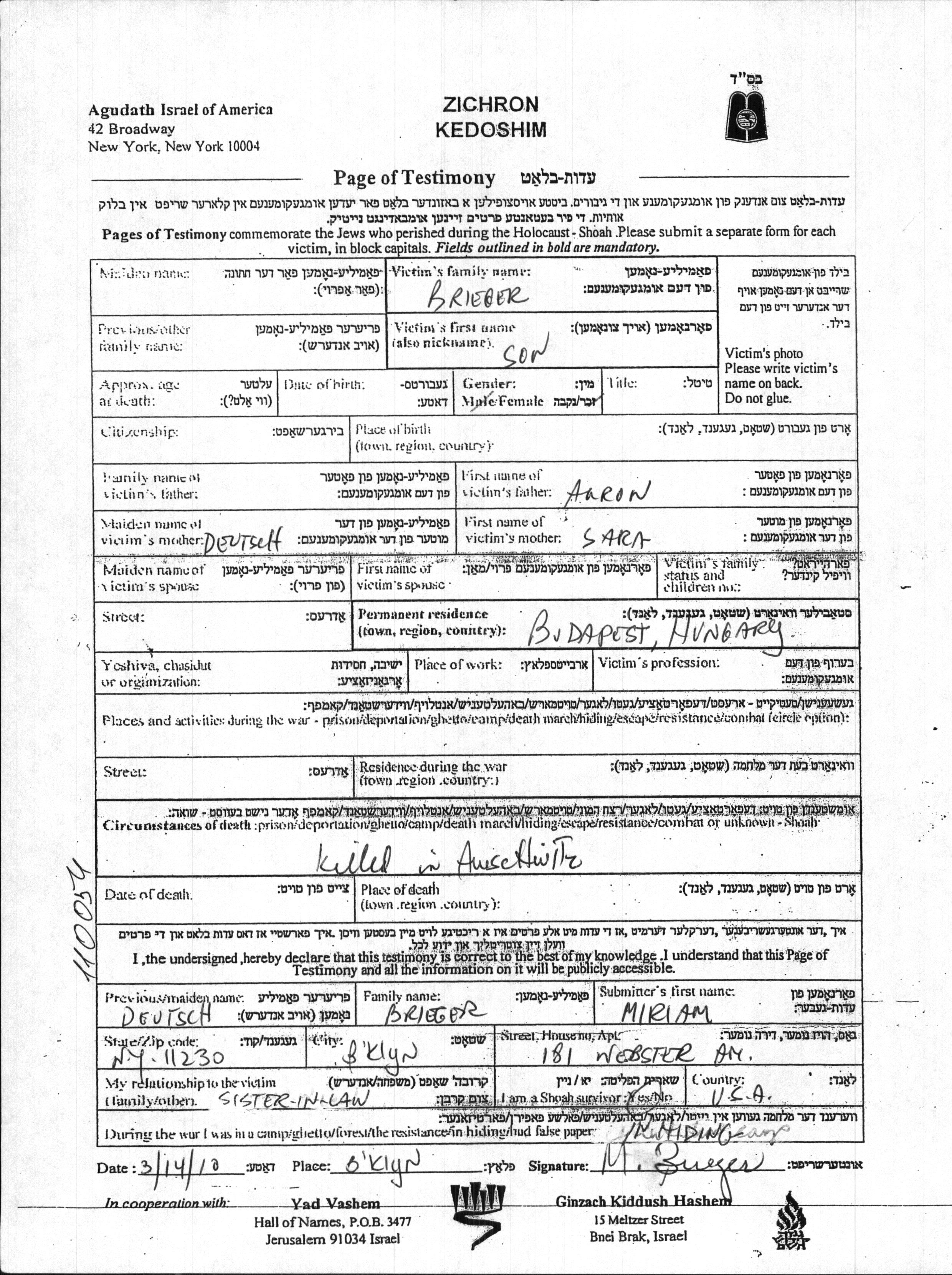 Бригер Имя неизвестно Будапешт, Венгрия Лист свидетельских показаний