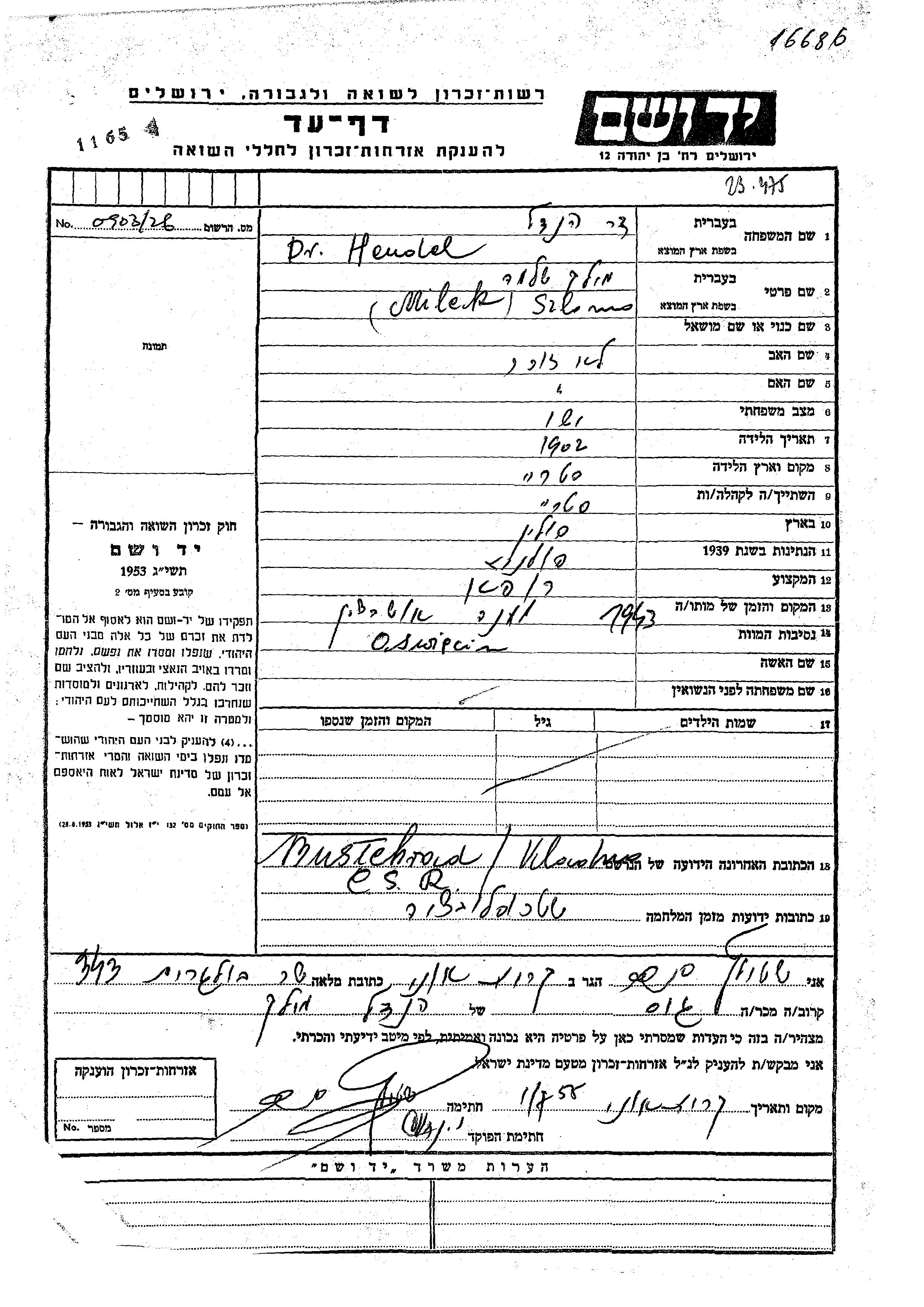 Др. Шломо Милек Хендель, место рождения: Стрый, Польша. Врач. Женат / замужем. Место жительства до войны: Стрый, Польша. Место во время войны: Стрый, Польша.