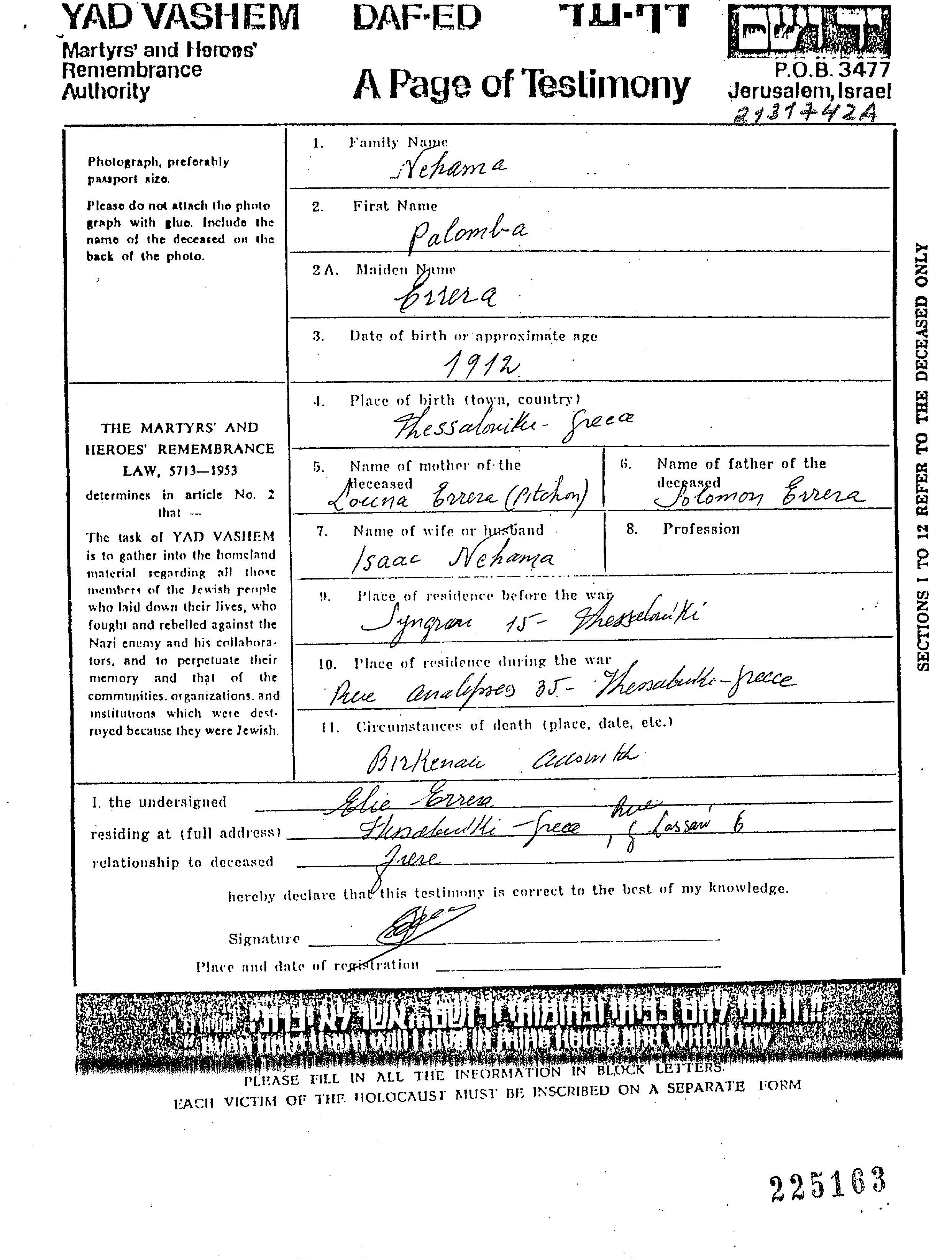 Нехама Паломба 1912 Салоники, Греция Лист свидетельских показаний