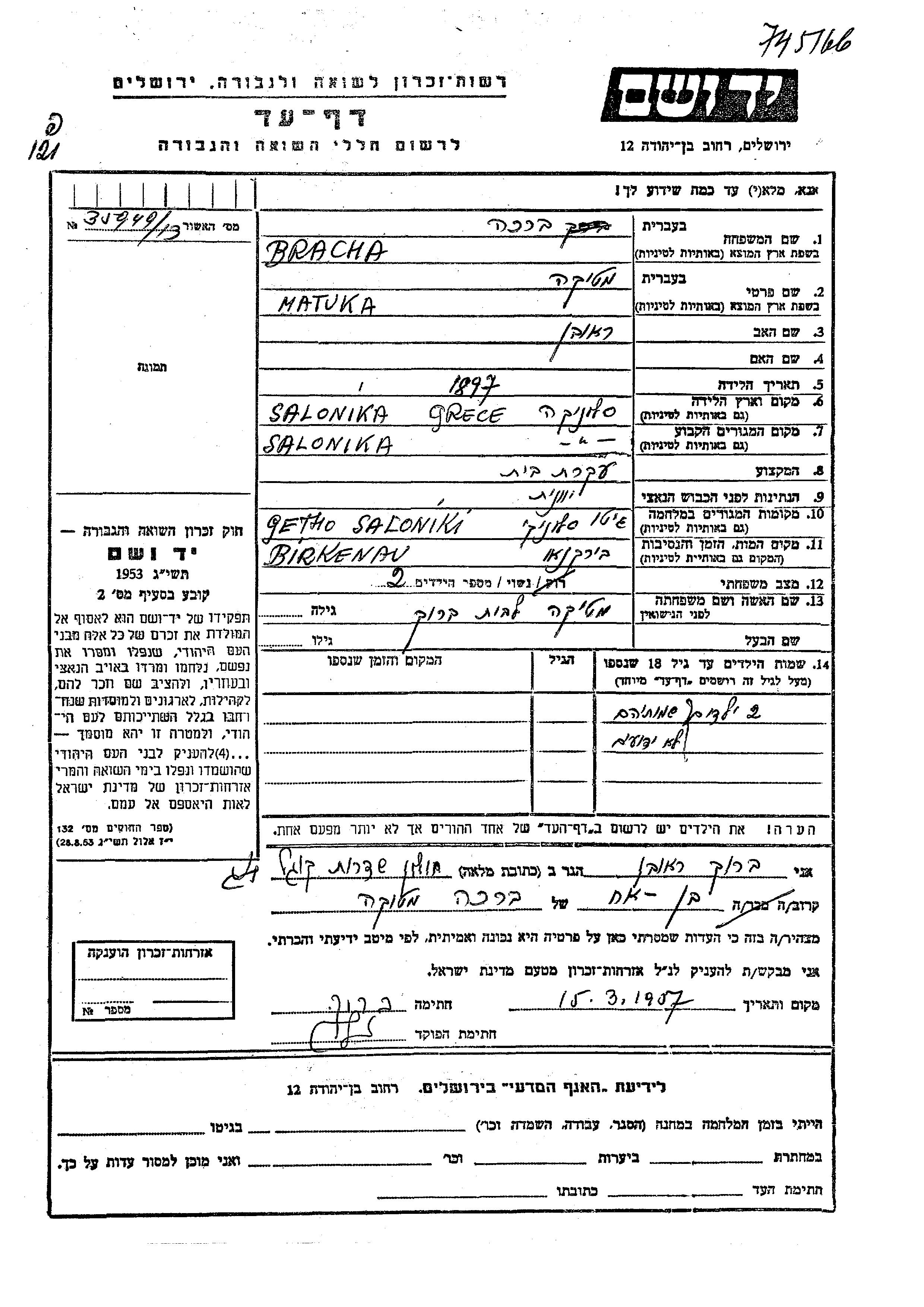 Матука Браха, девичья фамилия Барух, место рождения: Салоники, Греция. Отец: Реувен. Домохозяйка. Женат / замужем. Место жительства до войны: Салоники, Греция. Место во время войны: Салоники, Греция.